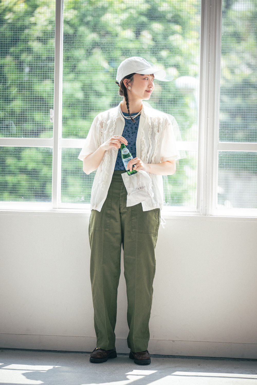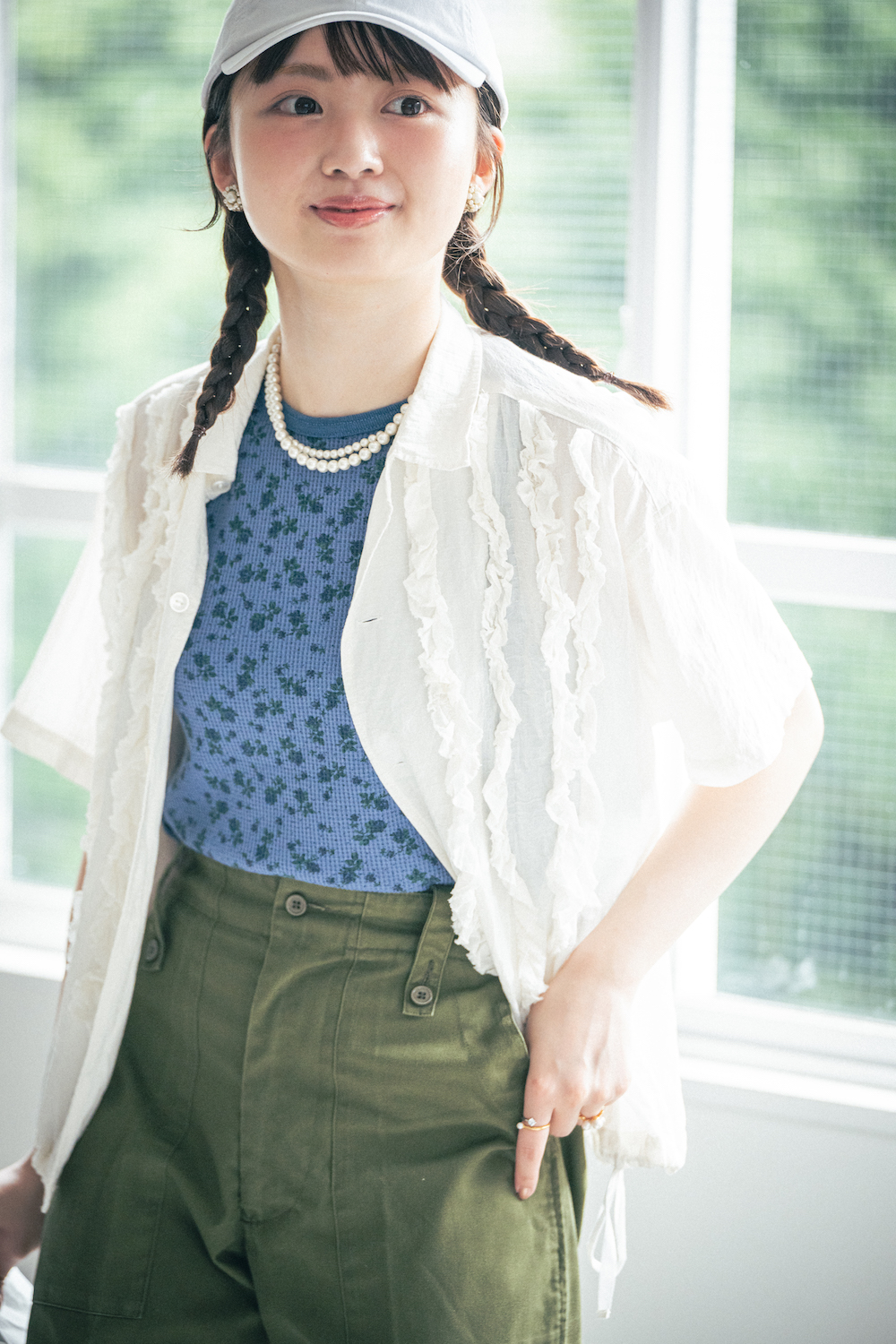 「夏の暑い日でもレイヤードを楽しめるように、透け感のあるシャツをはおりに。全体のシルエットはあえてメンズライクにまとめつつ、フリルやパールなどの小物で自分らしい“甘さ”を足しました。トップスはインして、脚長効果も意識!週末の公園デートや、美術館・カフェめぐりにぴったりなコーディネート。歩きやすいローファーに、帽子と炭酸水で“夏のお出かけ感”をプラスしています。日差しの強い日でも、透けシャツとキャップで快適&可愛さをキープできるところがポイント!」