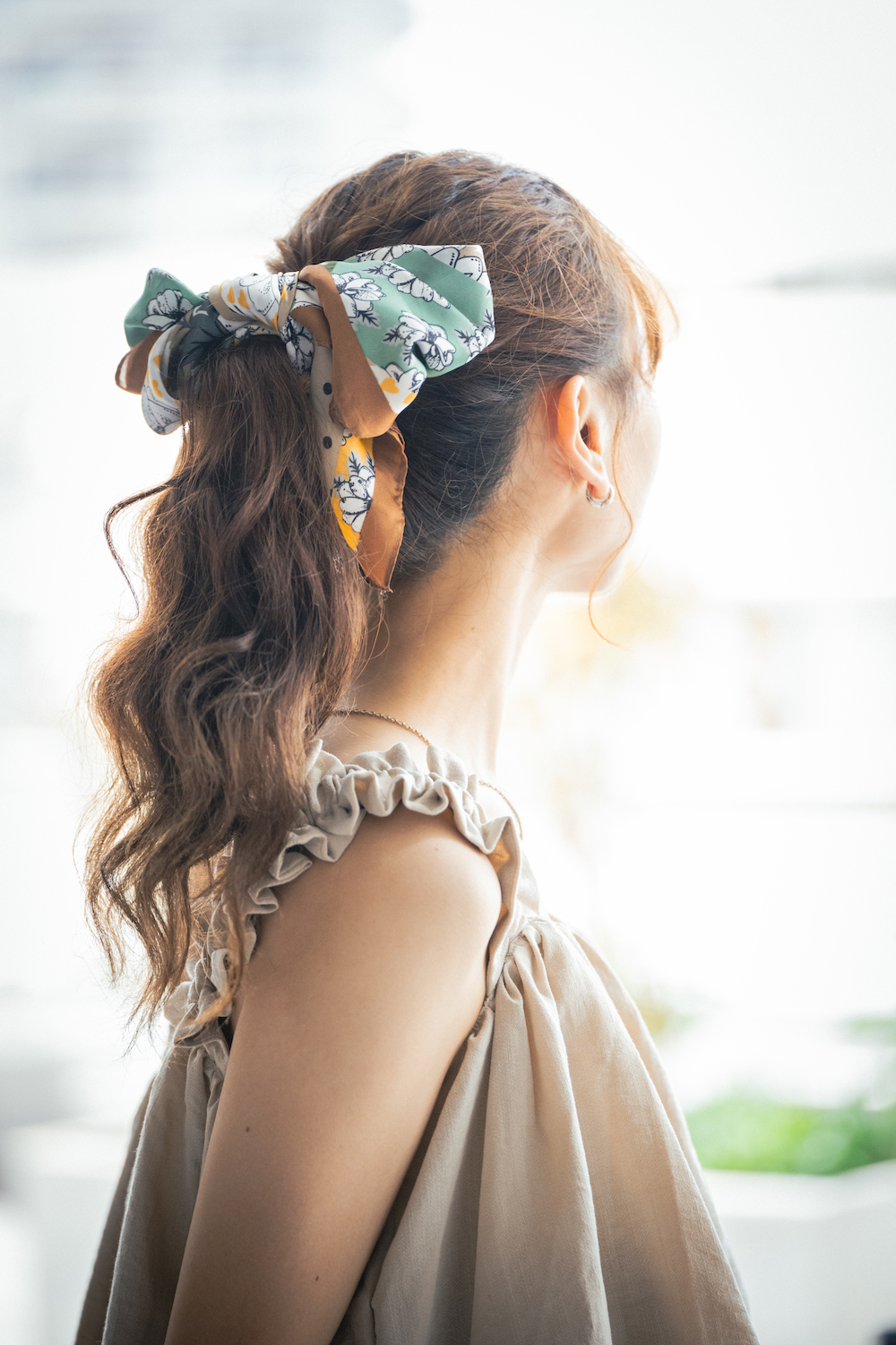 「少し遠出してきれいな海が見えるカフェに出かけた日。ふわっとフリルいっぱいの可愛いノースリーブブラウスをワイドデニムと合わせて着ていました。風が強そうだなと思ってまとめ髪にして、カラフルなスカーフをへアドレスに。後ろ姿に華やかさをプラスしたのがポイントです」