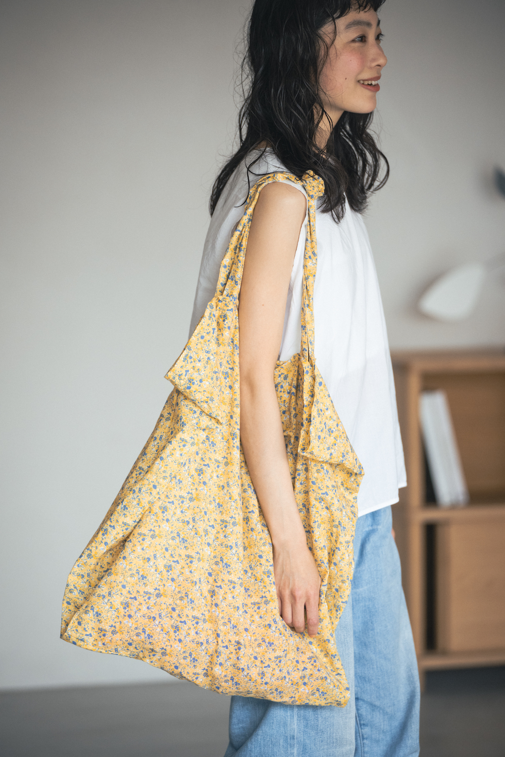 「《ヤエカ》のデニムは、一年中履いている、超お気に入りの一本。夏は黄色やベージュ、キャメル系のアイテムと合わせて、晴れやかで軽やかな装いを心がけます。花柄のバッグは色違いで持っているもの。容量たっぷりだし、着こなしのアクセントに使えるし、重宝します」