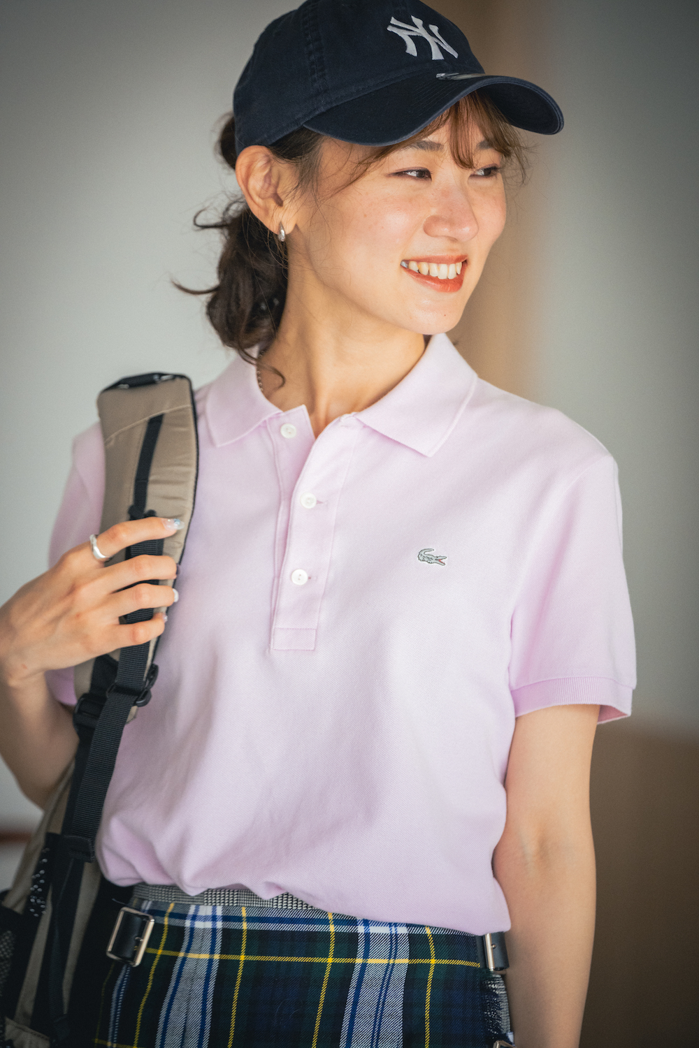「そろそろ虫の声も聞こえてきて、暑いながらも秋が近づいていることを感じずにはいられません。それで選んだのが、タータンチェックのラップスカート。ポロシャツとキャップを合わせ、スポーティ方向に転ばせれば、暑い日での違和感はありません。《ラコステ》のポロシャツは可愛いピンクがお気に入り。カジュアルな小物を持って、全体をいっそう軽快な印象に仕上げます」