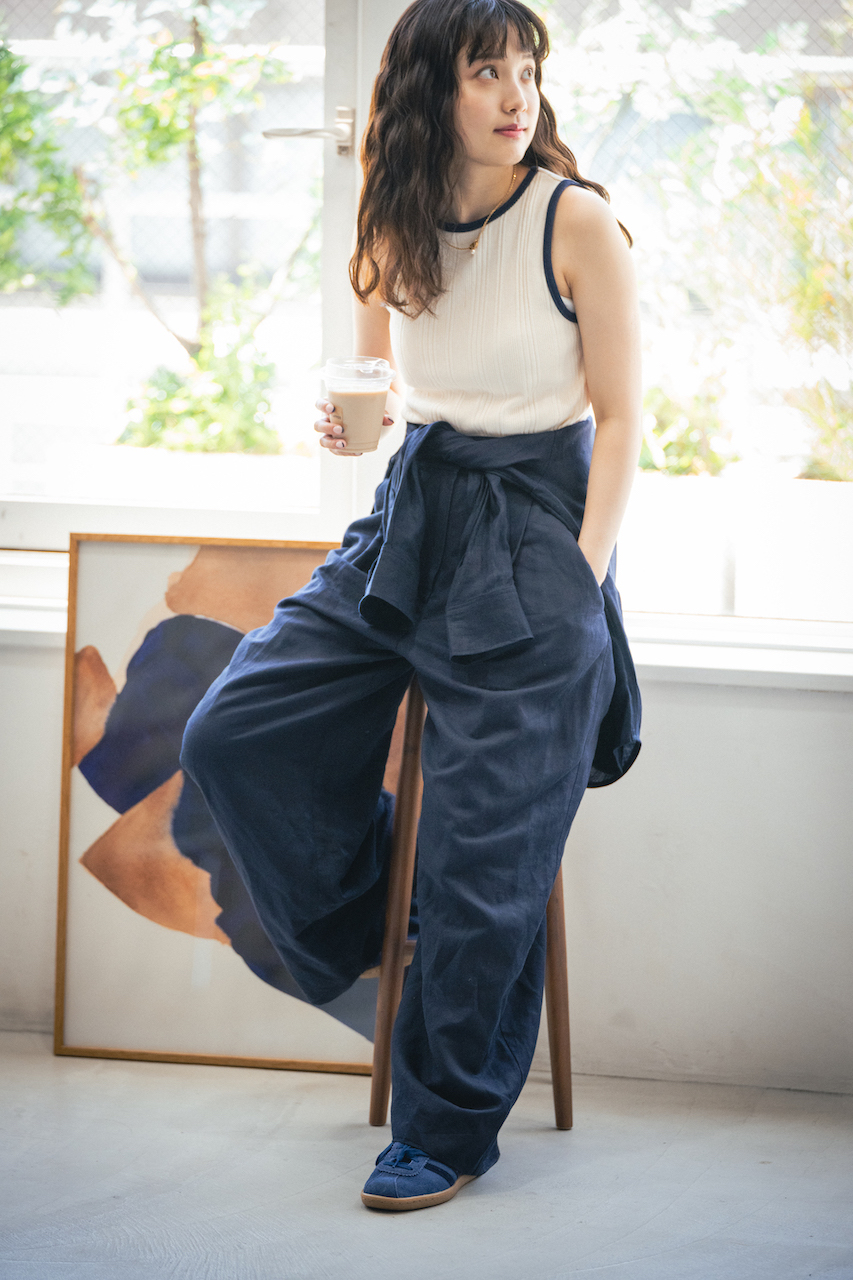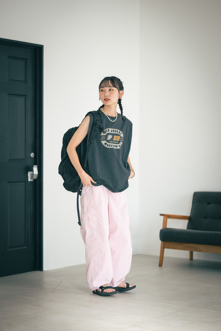 ルーズなボトム&ノースリーブでゆったりこなれ感のあるスタイルへ