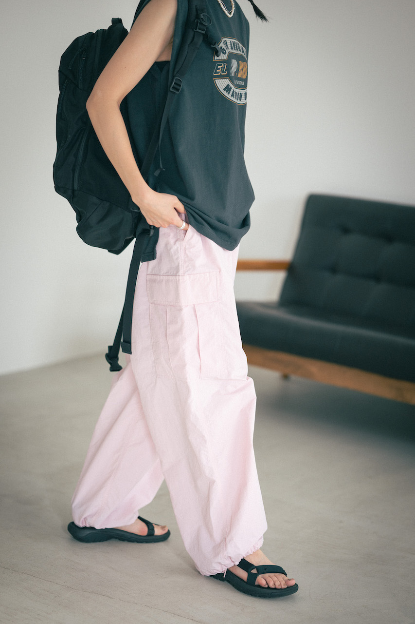 淡いペールピンクがオシャレなカーゴパンツにはダークカラーのトップスで引き締めるのが正解。全身ルーズなボーイズコーデはピンクの差し色やパールアクセで甘さを増して。