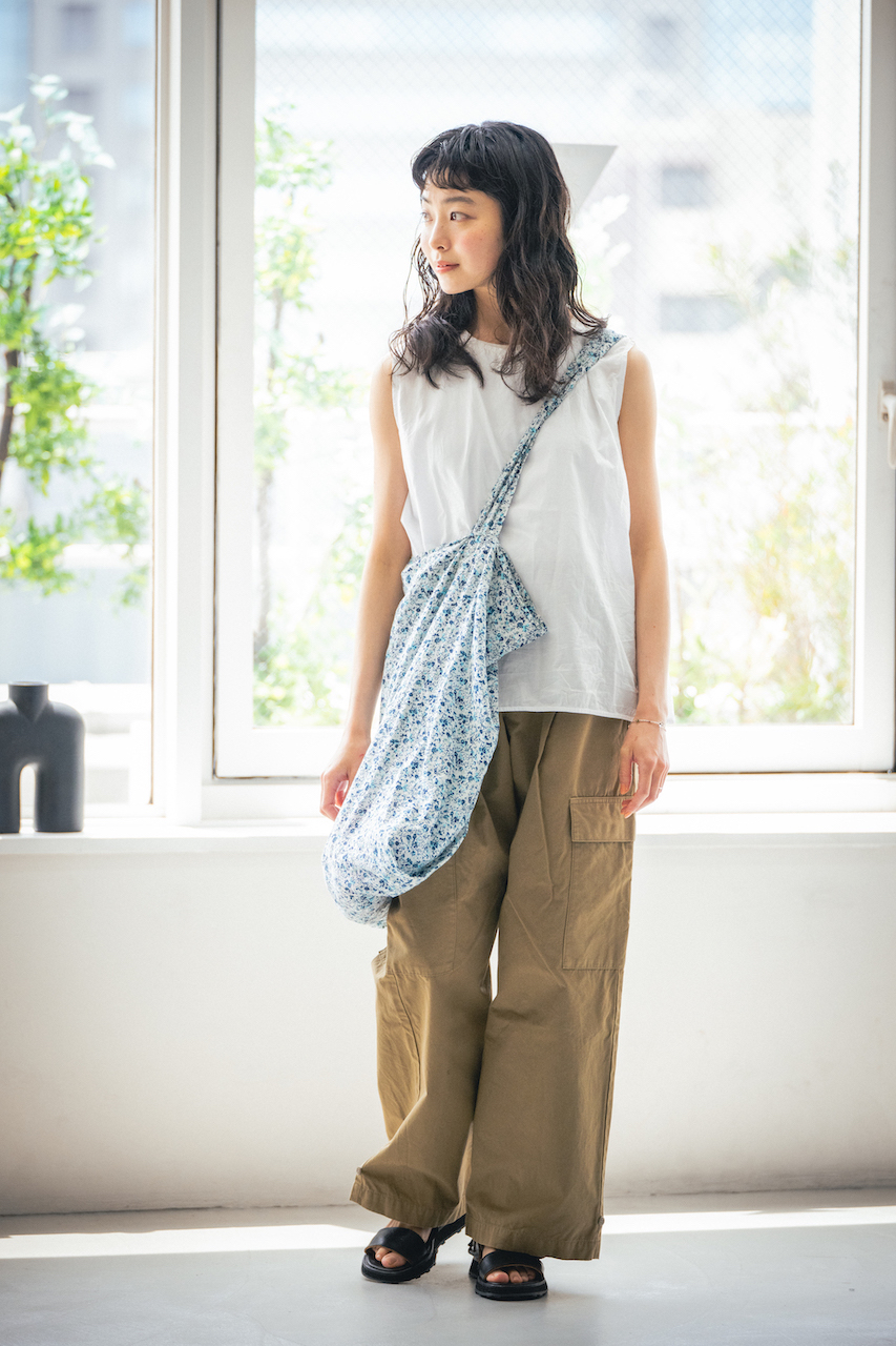 脚にフィットしないルーズなカーゴパンツなら真夏でも涼やか。ノースリーブトップスでヘルシーに肌見せして軽やかさをキープ。キュートな小花柄バッグをアクセントにして。