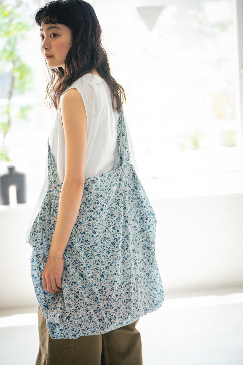 爽やかなブルー生地のルーズボトムは鮮やかな花柄も夏らしい。存在感のあるボトムは無地のスリーブレスブラスですっきり着こなして。ビビッドなオレンジバッグも好スパイス。