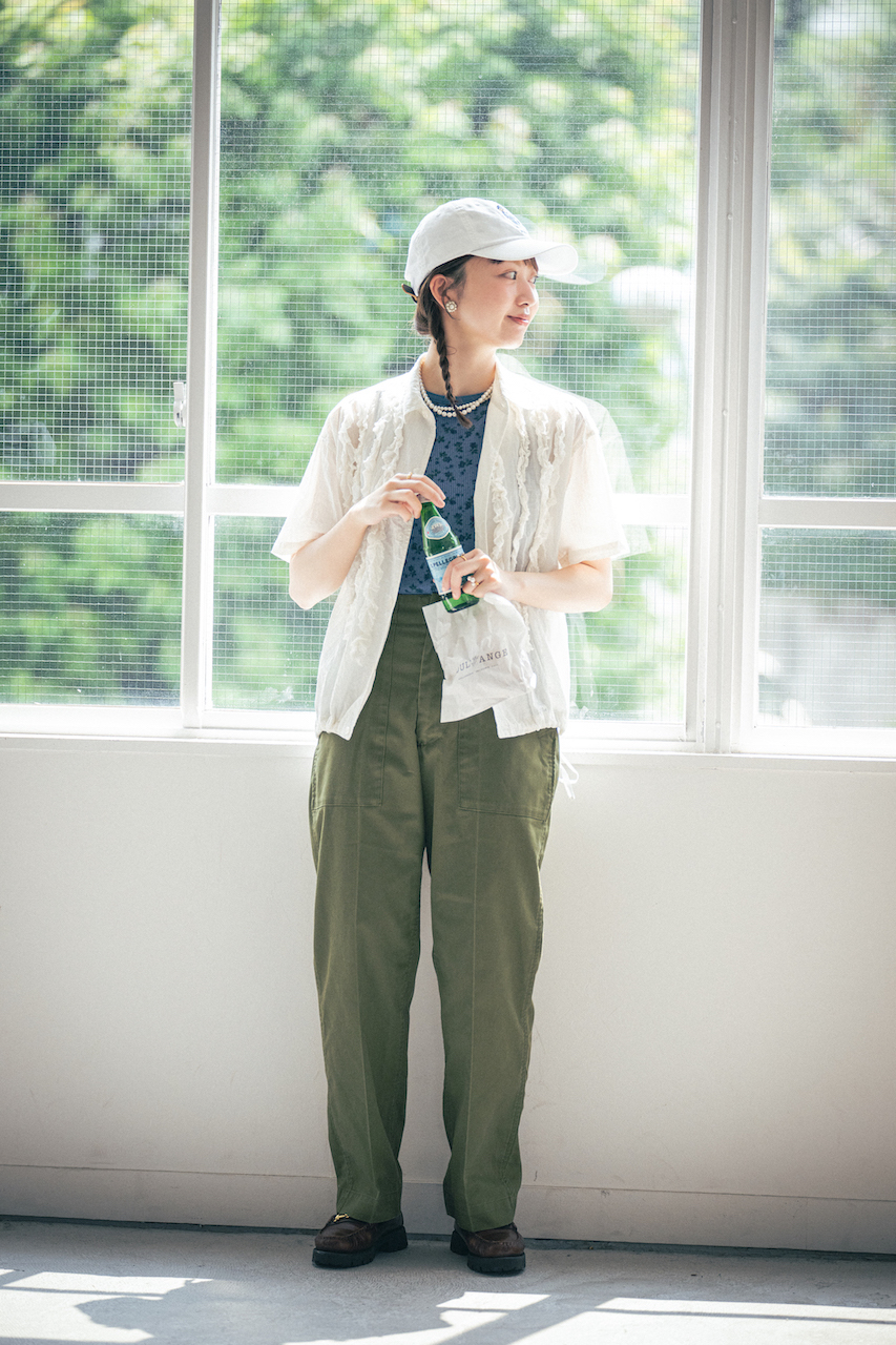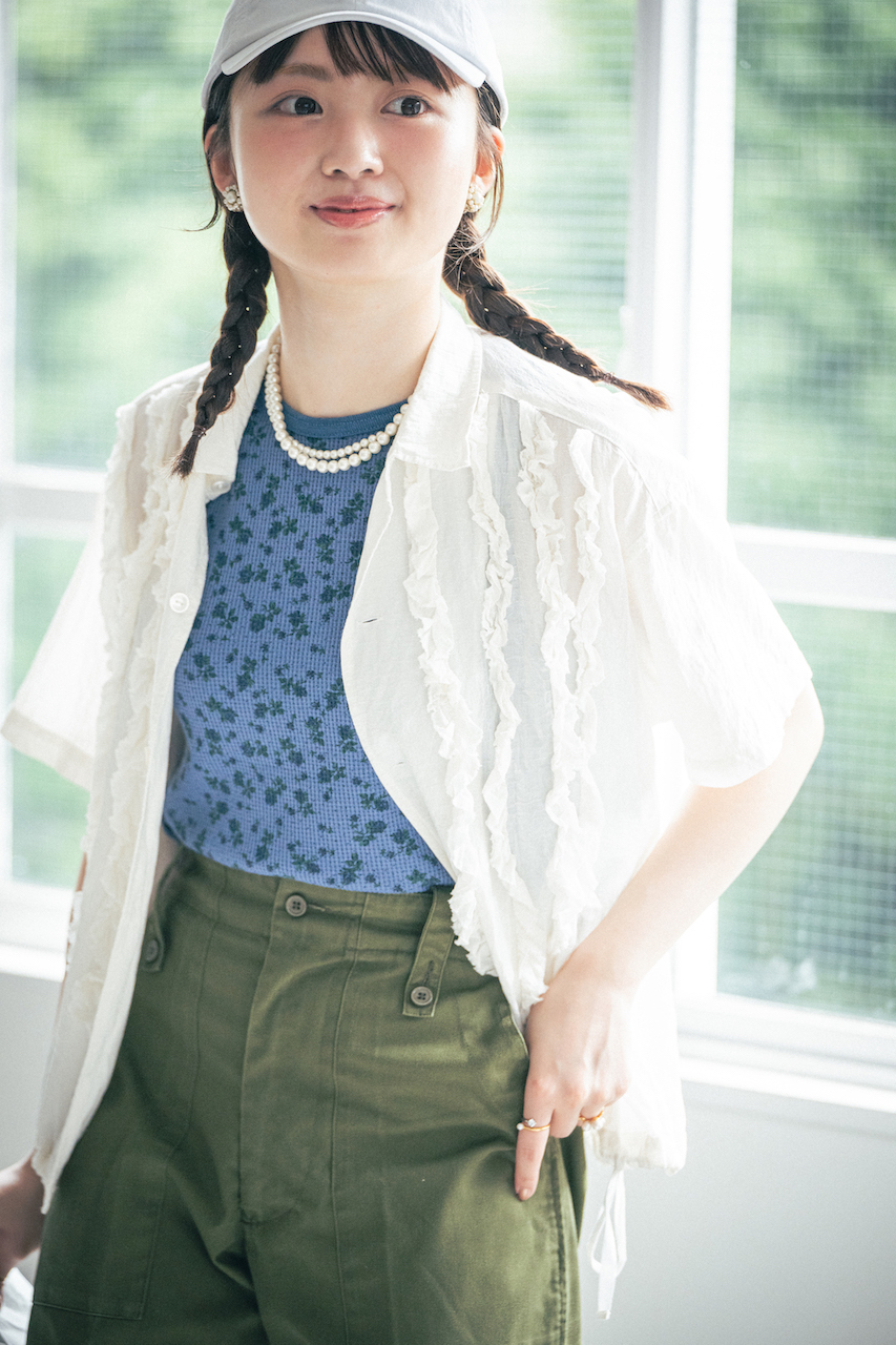 ルーズなカーゴパンツはトップスをINすると脚長効果抜群! ガーリーなフリルシャツを羽織って王道の甘辛MIXにアレンジ。小物もキャップとパールなどMIX感のある仕上がりに。