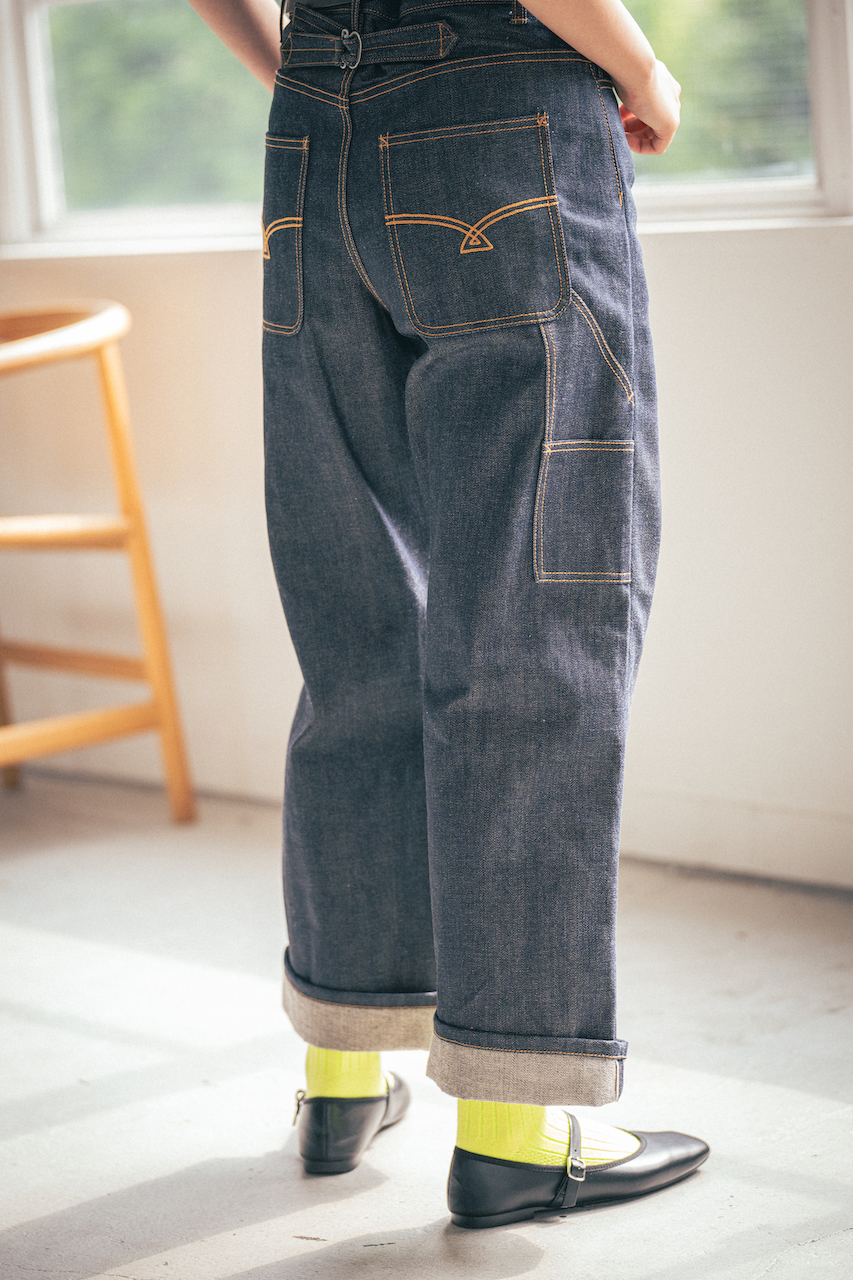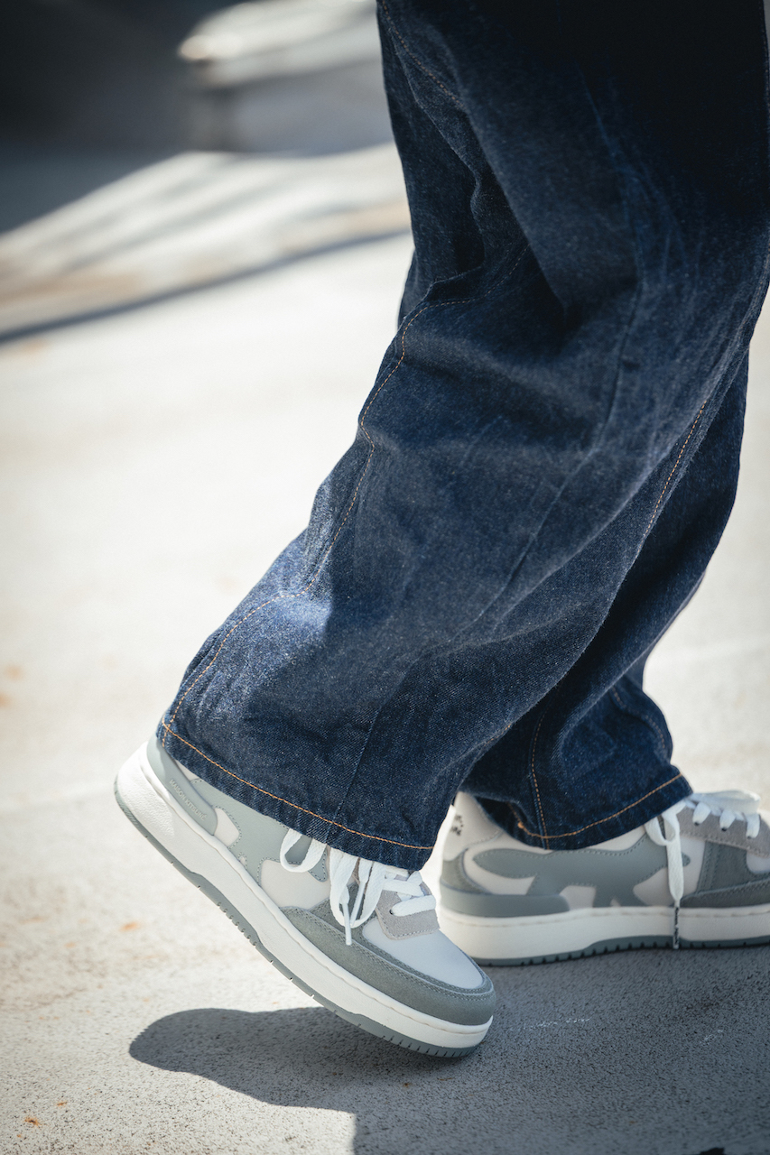 シルエットに特徴のあるデニムは、インディゴカラーが秋の装いにもマッチ。ゆったりTシャツをINしてスッキリ着よう。真っ赤なキャップを差し色にして、コーデに彩りを足して。
