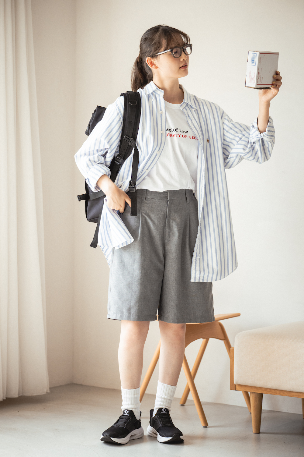 本人私物(ワイシャツ/POLO RALPH LAUREN、Tシャツ/GEORGES 、パンツ/Dot and Stripes、ソックス/靴下屋、シューズ/CONVERSE、バッグ/Manhattan Portage、 メガネ/パリミキ)