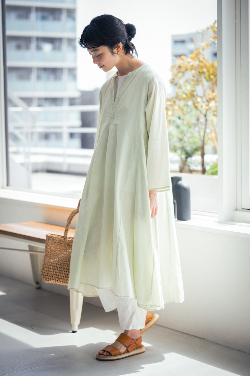 「さわやかなグリーンが着ていて心地よいワンピース。首元や袖口からのぞかせるインナーによって大きく印象が変わるのでコーディネートを考えるのが楽しい一着です。まだ時折気温の高い日がある今の季節は白のリネンパンツを合わせているけれど、もう少し秋が深まったらデニムとも合わせようかな?」
