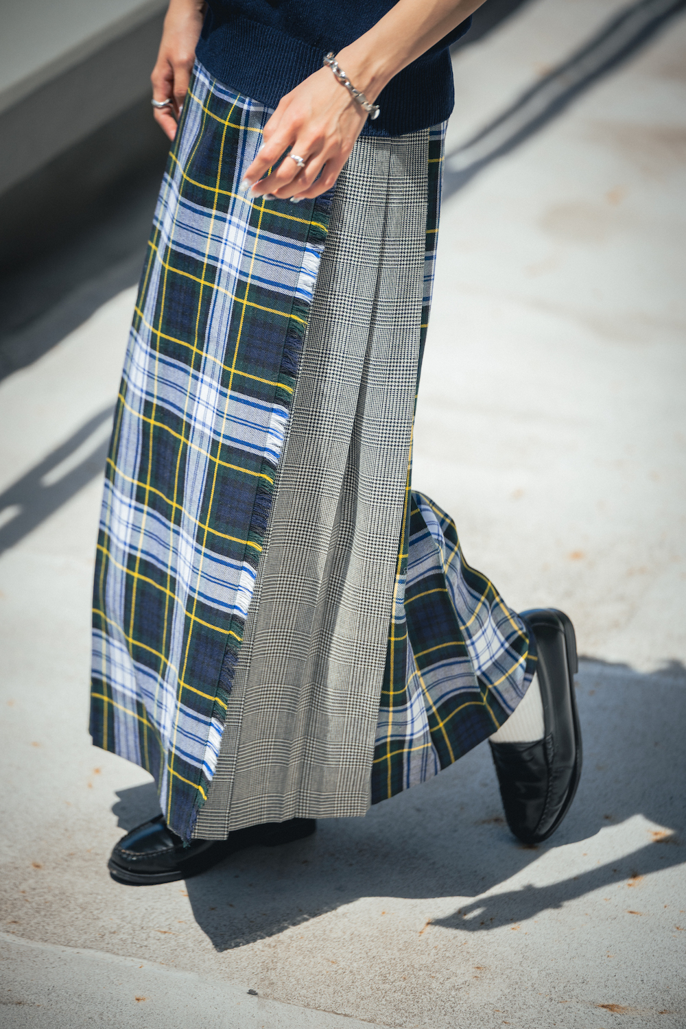 「そろそろベストの出番!と思って組んだ、爽やかプレッピーコーディネートです。同系色でまとめつつ、トーンを変えることでメリハリ付けをして、のっぺりした印象を回避。ふたつのチェックを組み合わせたトラッドなスカートは、今年活躍させています」