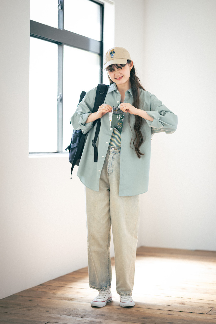 シャツとデニムをくすんだペールカラーで統一して、秋らしい色合いに。主役の色に寄り添うベージュキャップ&白スニーカーと、引き締め色の黒リュックのバランス感が絶妙。