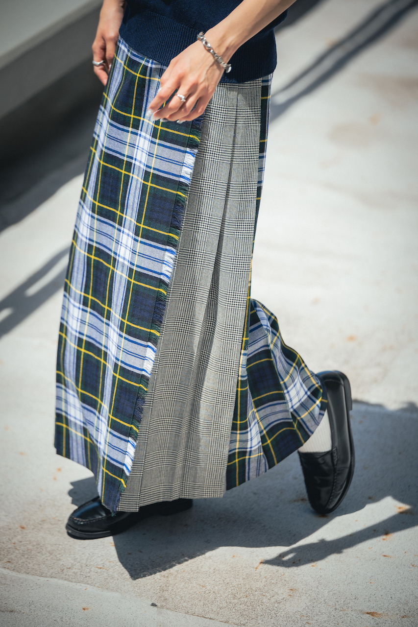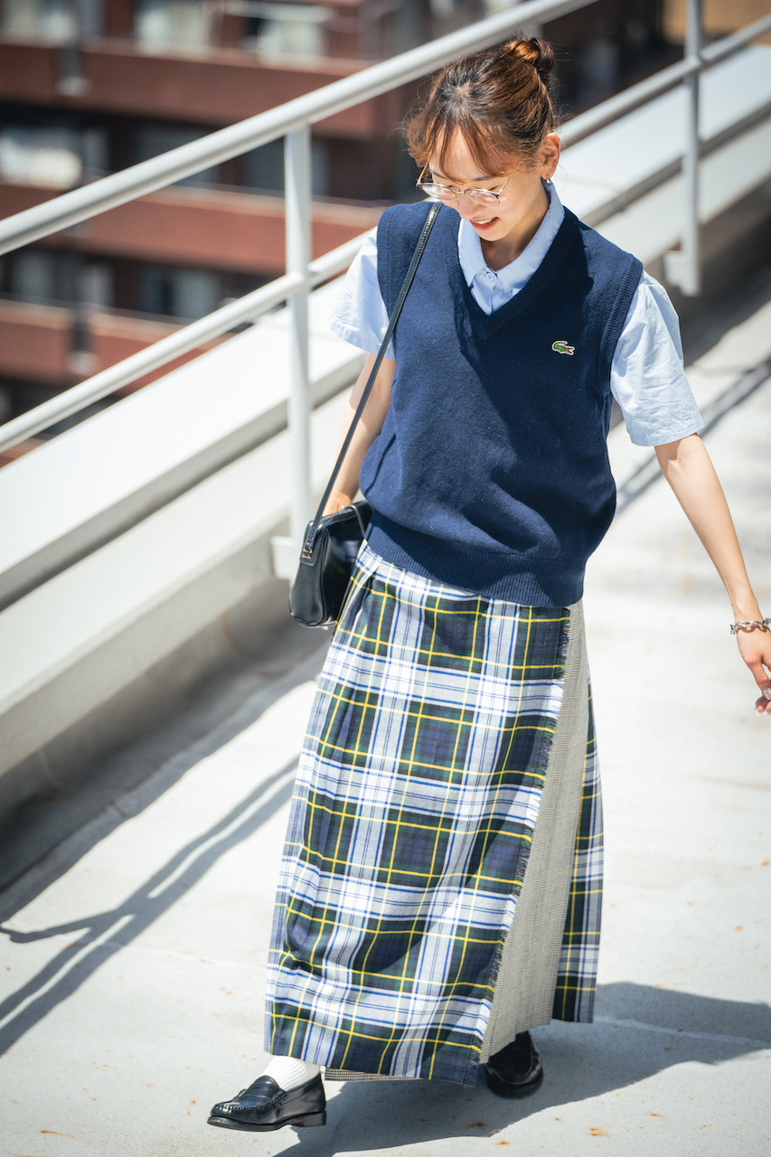 1着でトラッドな表情を醸し出せるチェック柄のキルトスカートは、シャツ&ベストの重ね着を合わせてグッドガールに着こなしたい。半袖を選んで残暑対策も抜かりなく。