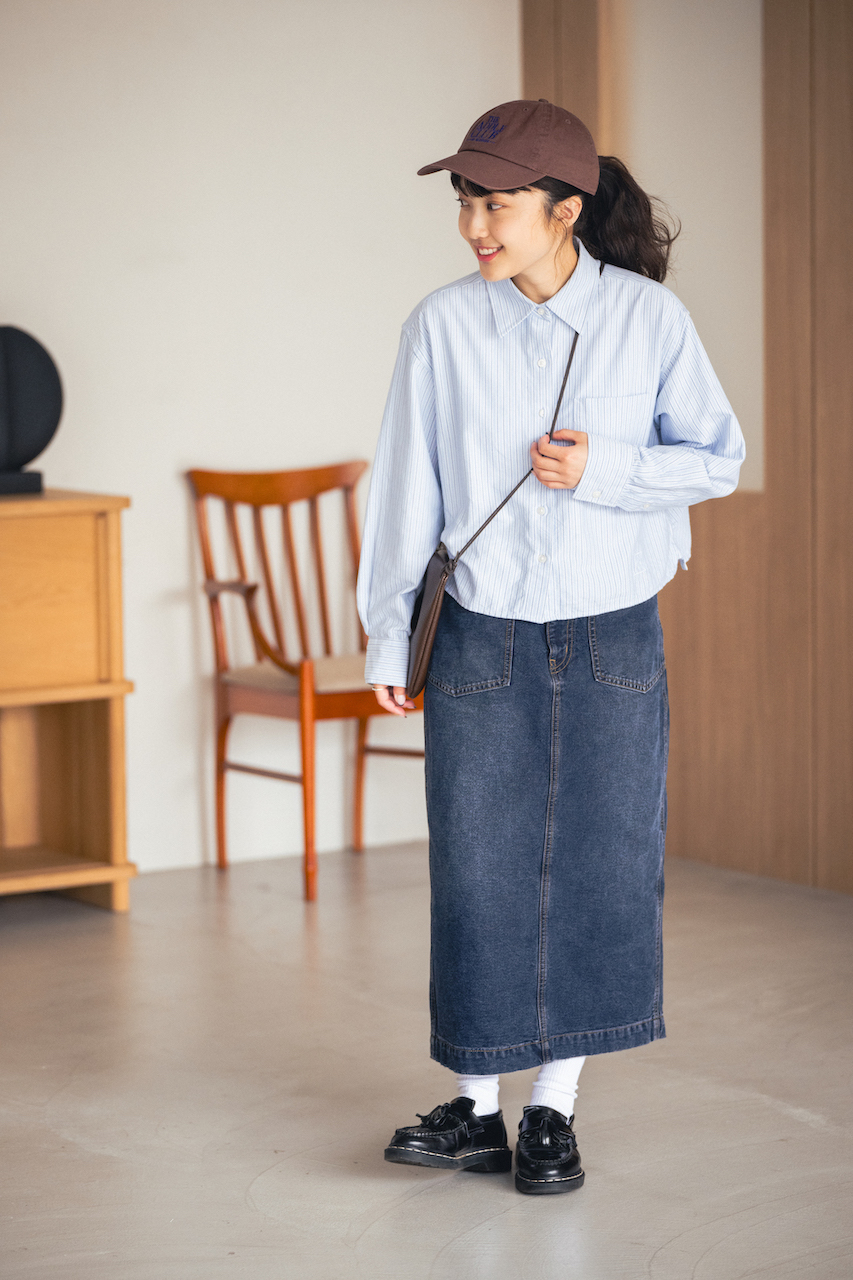 細いラインが知的な印象のシャツは低身長さんがバランスよく着こなせる短丈がポイント。ストレートラインのデニムスカートでスッキリ着よう。ブラウン小物で秋仕様にチェンジ。