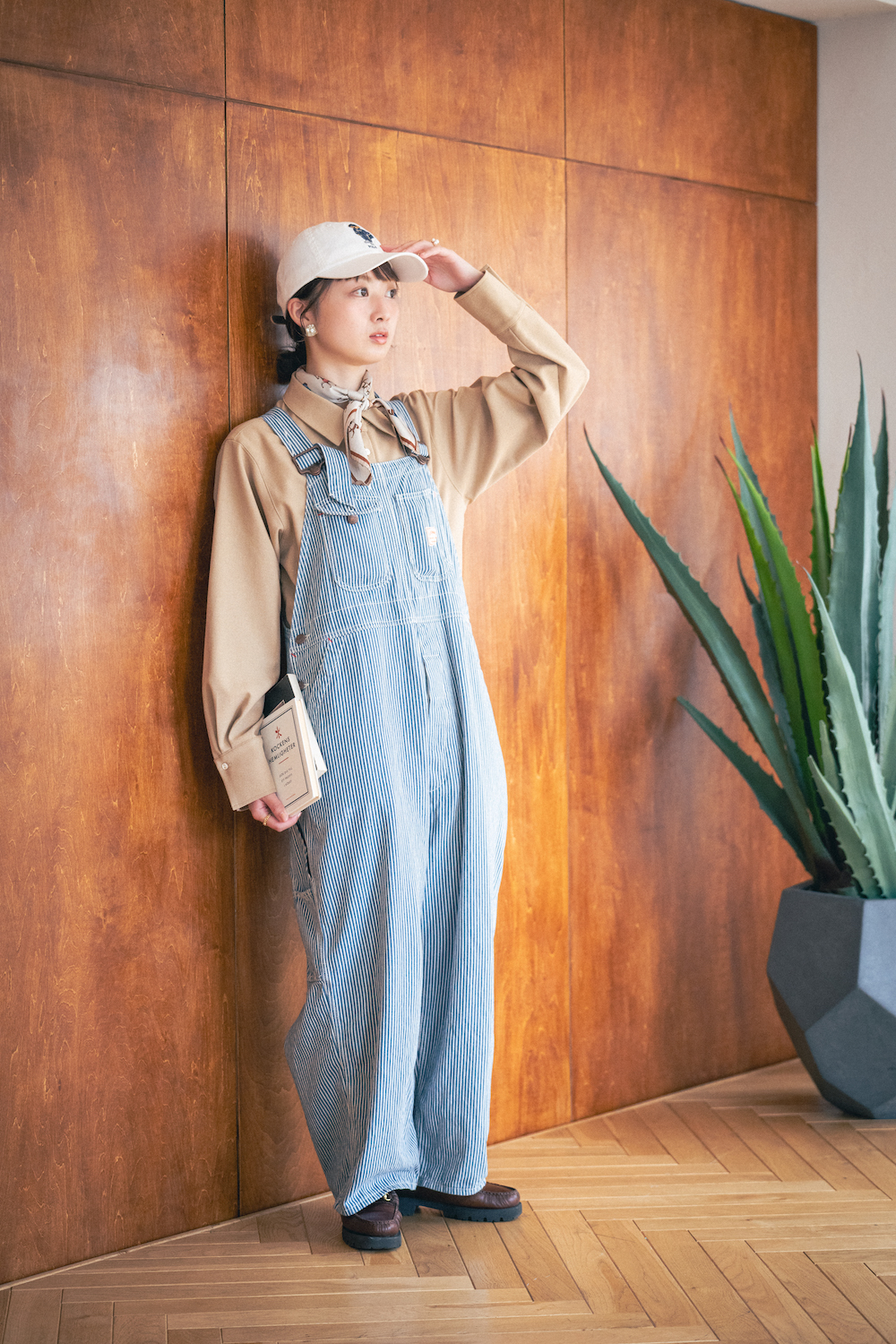 アメカジテイストのストライプ柄のオーバーオールを、あえてキレイめなベージュシャツや、スカーフ使いでレディに味付けするのが新鮮! 小物やアクセもMIX感を楽しもう。