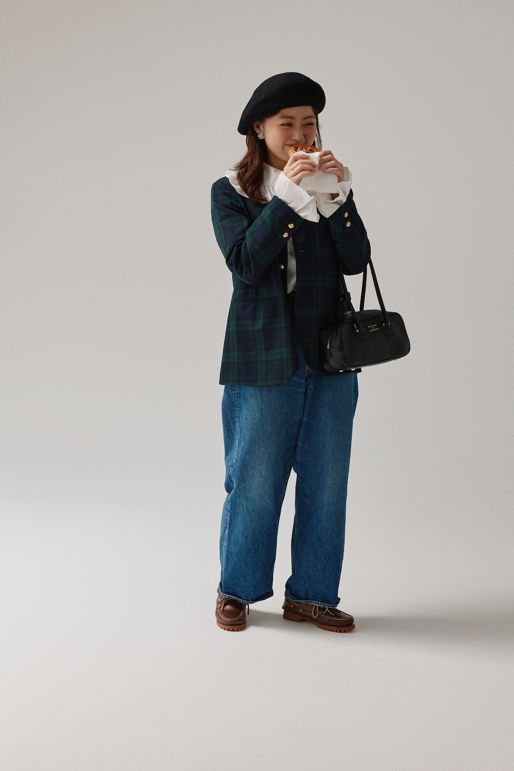 「この秋、活躍させたいコーディネートのひとつがこれ。クラシックなチェックジャケットにあえてフリルブラウスを合わせて、レディなムードをトッピングするんです。甘さがベタつかないように、デニムでカジュアルダウンするのがポイント!ともすると堅苦しくなりがちなトラッドな着こなしだけれど、こんなふうに一新しています。金ボタンがさりげなくジュエリーみたいなアクセントになってくれるのもうれしい」