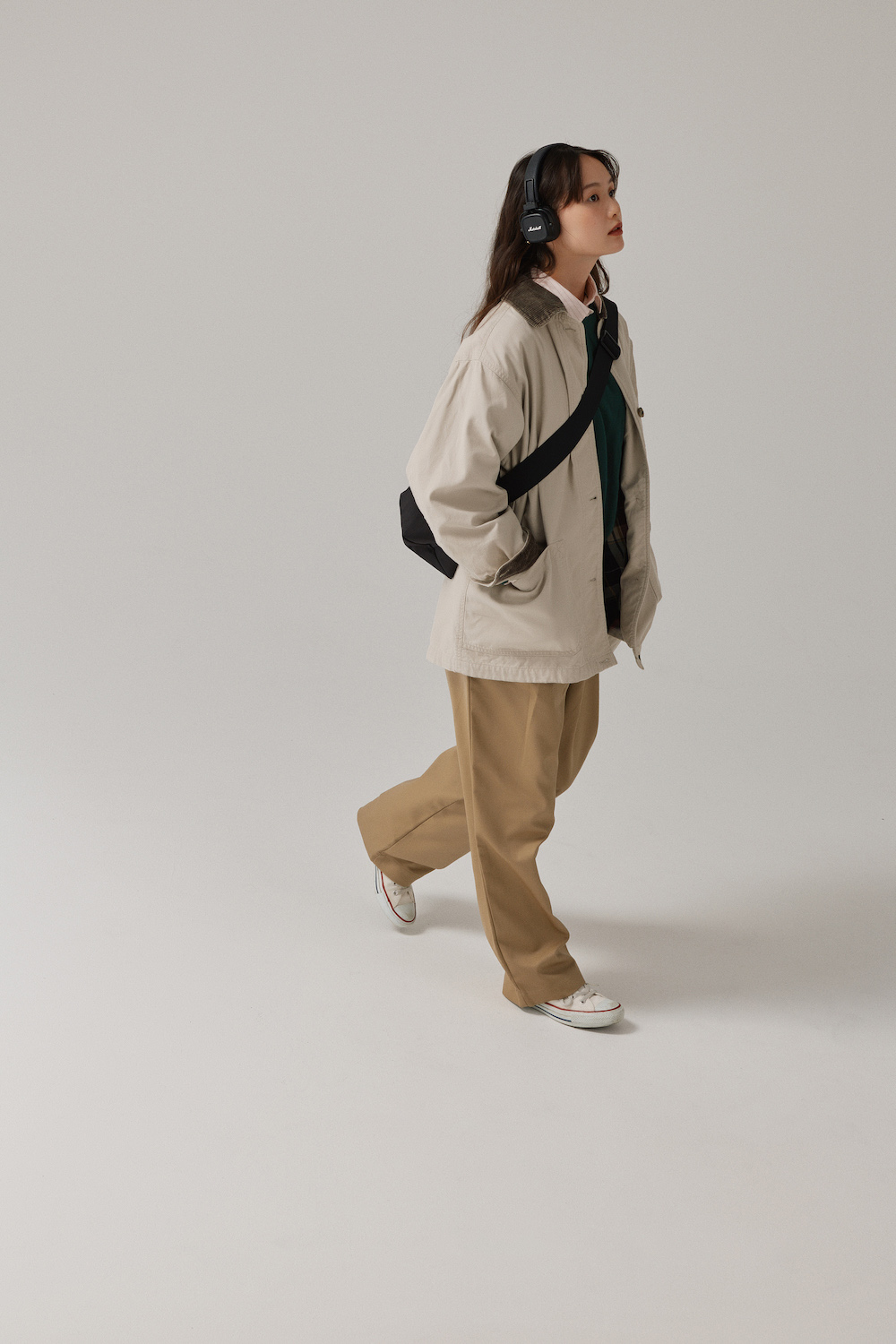 「グリーンとピンクの組み合わせは、私のいまいちばんの推しです!今日は、グリーンのスウェット×ピンクのストライプシャツで取り入れてみました。男の子っぽく仕上げたいなと思って、ボトムには最近手に入れた、だぼっとシルエットのチノパンツを。フィールコートを羽織ったら、完成。」