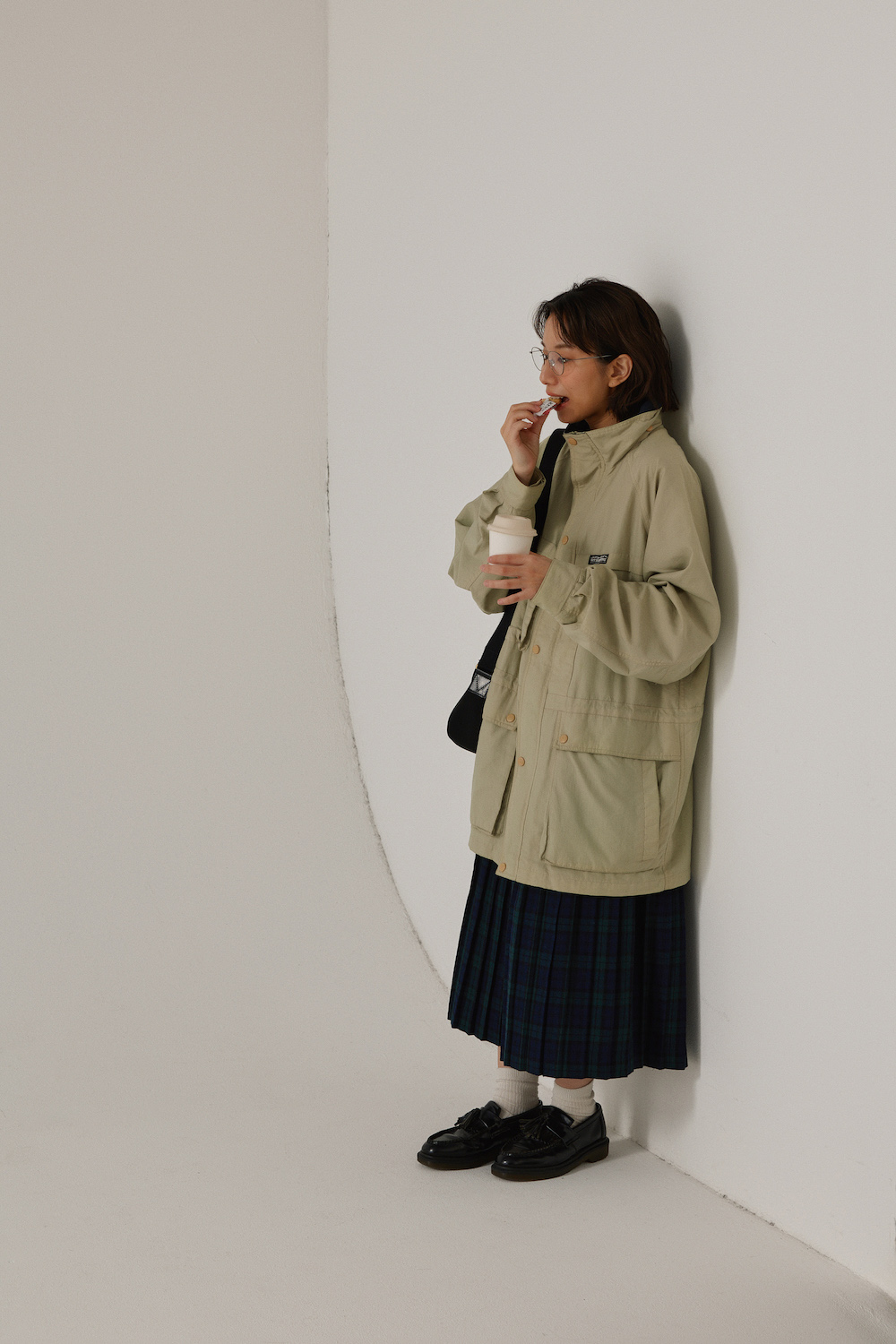 「ナイロンジャケットのスタンドカラーとメタルフレームの眼鏡の組み合わせは相思相愛。プリーツスカートとタッセルローファーのプレッピーな着こなしは、私らしく着ていて楽なんです。甘さは加えず、さらっとまじめに着こなすのが好きです」