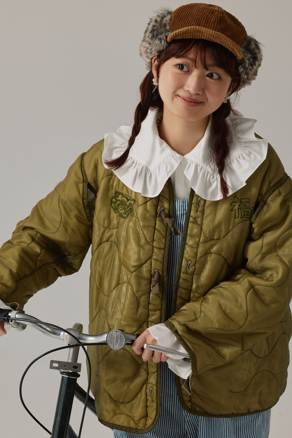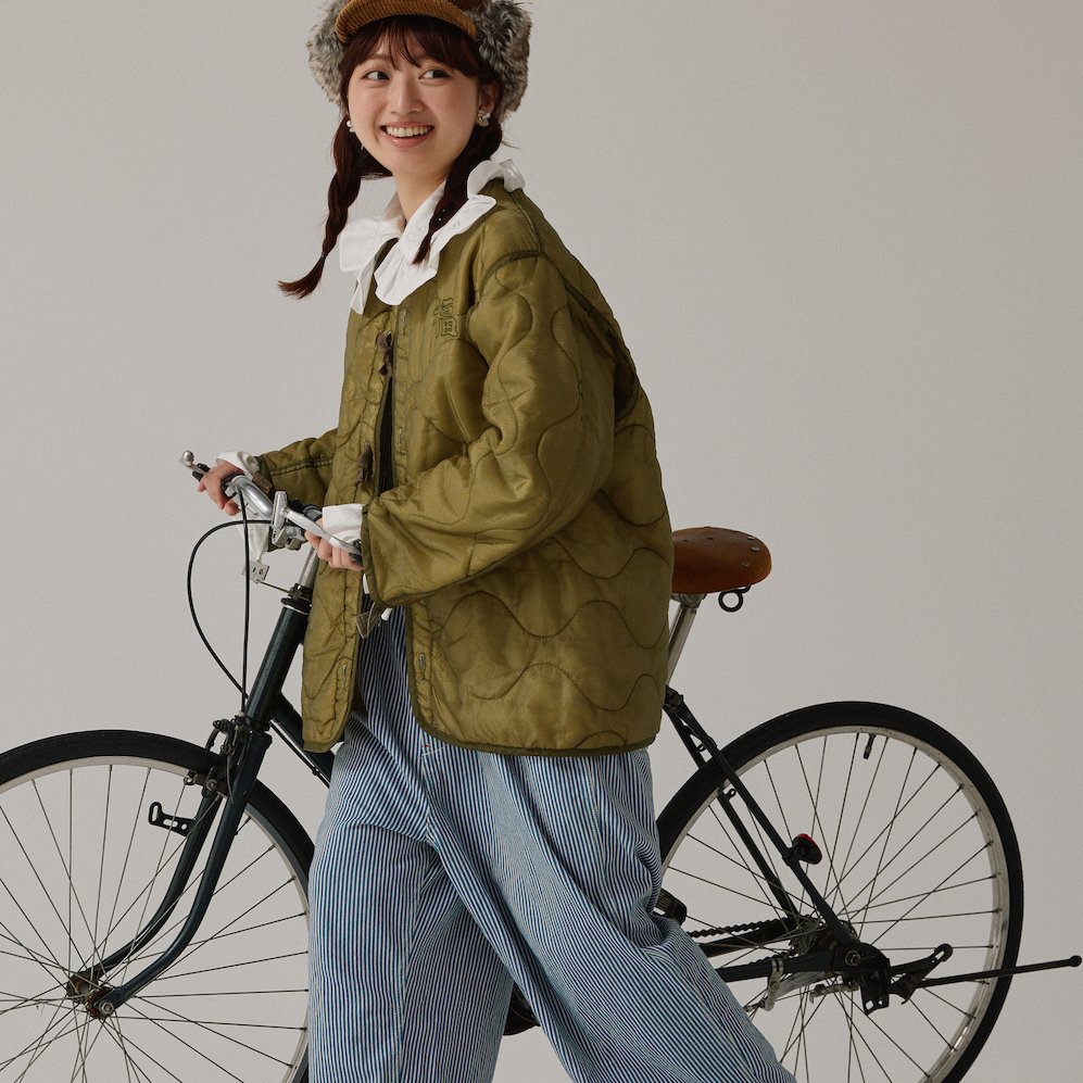 「駅までだけでなく、2駅分くらいなら自転車で移動しちゃうことが多い私。冬は、防寒力が高くて見た目GOODなこのミリタリージャケットに頼りっぱなしです。たいていオーバーオールを合わせて、足さばき楽ちんなコーディネートにしています。今日はフリルカラーのブラウスで少し甘さをプラスして、遊び心のあるスタイルに。お気に入りのもこもこキャップで北風にも負けないよ」