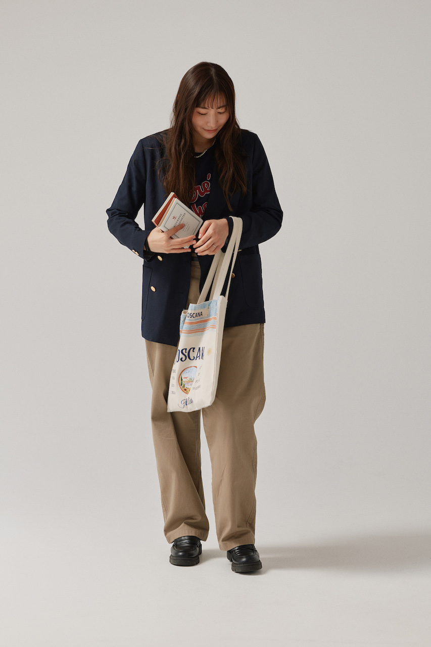 「秋になると、図書館が似合うような、紺のブレザーを着たくなります。よくやるのは、チノパンとの組み合わせ。ちょっとキャメル寄りのベージュのチノパンを合わせて、こっくりとしたあたたかい印象に仕上げるのが好きです。ロゴTシャツとプリントトートバッグをプラスして、カジュアルダウンさせました。ちょっと公園にお散歩をしに、行ってきま~す!」