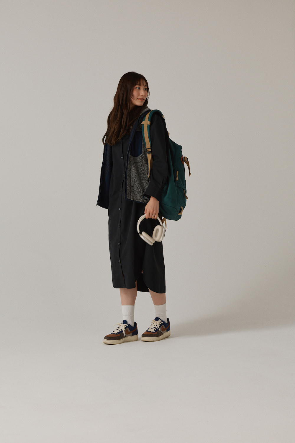 「厚手素材のシャツワンピースにボアベストのレイヤードは今の季節らしくてお気に入り。ワンピースの縦のラインを強調してスタイルアップ効果を狙いたいから、ベストの前は開けて着るのがポイント!リュックやスニーカーで色味を加えて全体的に重たすぎない印象にしました」