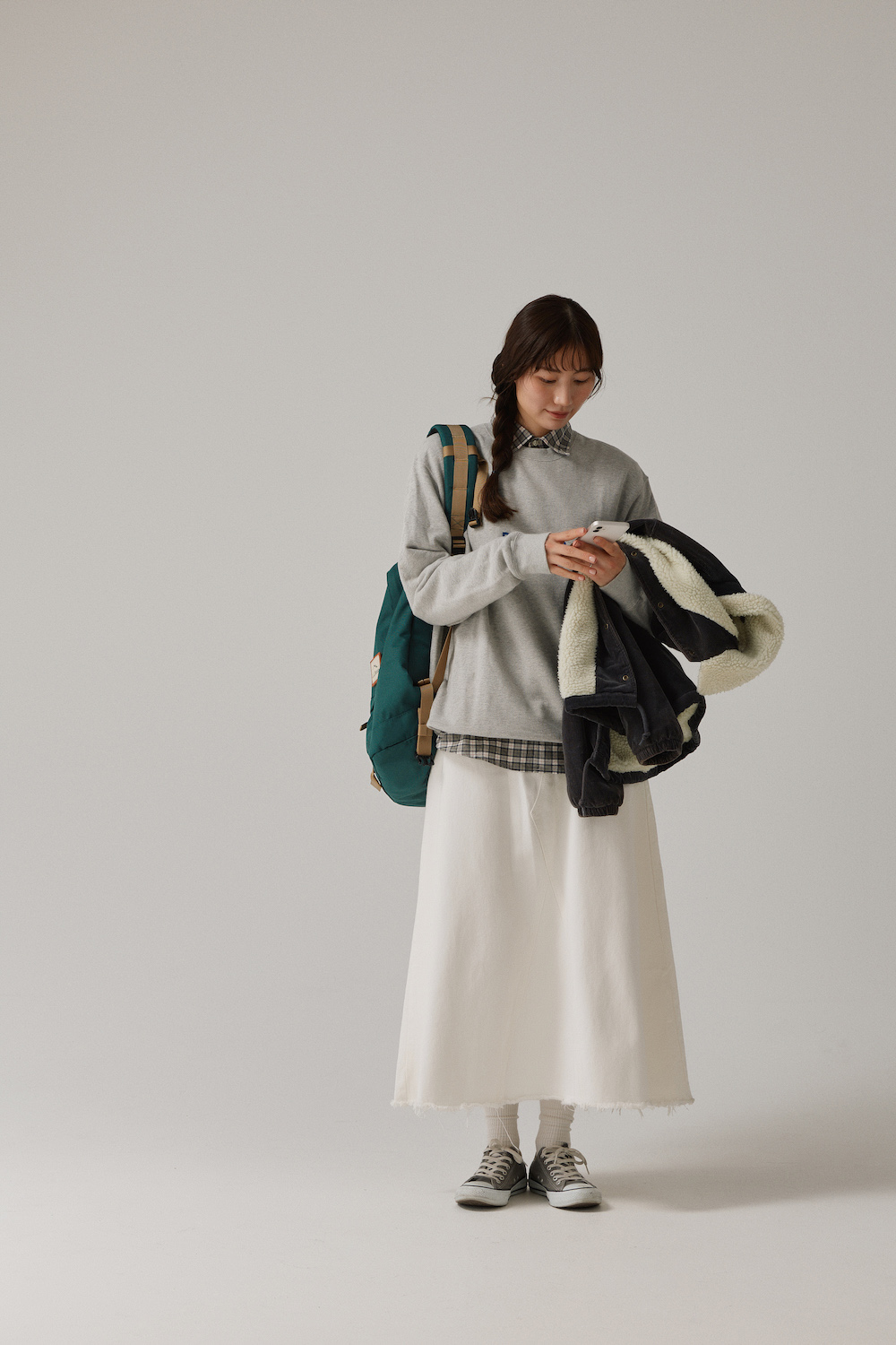 「コートを着るとどうしても重く見えてしまうのを避けるのに、活躍するのが白のデニムスカート。白と言えば夏を思い浮かべがちだけれど、通年で履けるデニムスカートなら簡単に取り入れられます。ロング丈を選んで、コーデの半分を白にするのがコツ。実は、ある意味、私らしさと言える高身長感を強調するのに、ロングスカートはよく履くアイテムなんです。いろいろと活躍するので便利ですよ。トップスはスウェットからチェックのシャツを覗かせる定番のレイヤードで」
