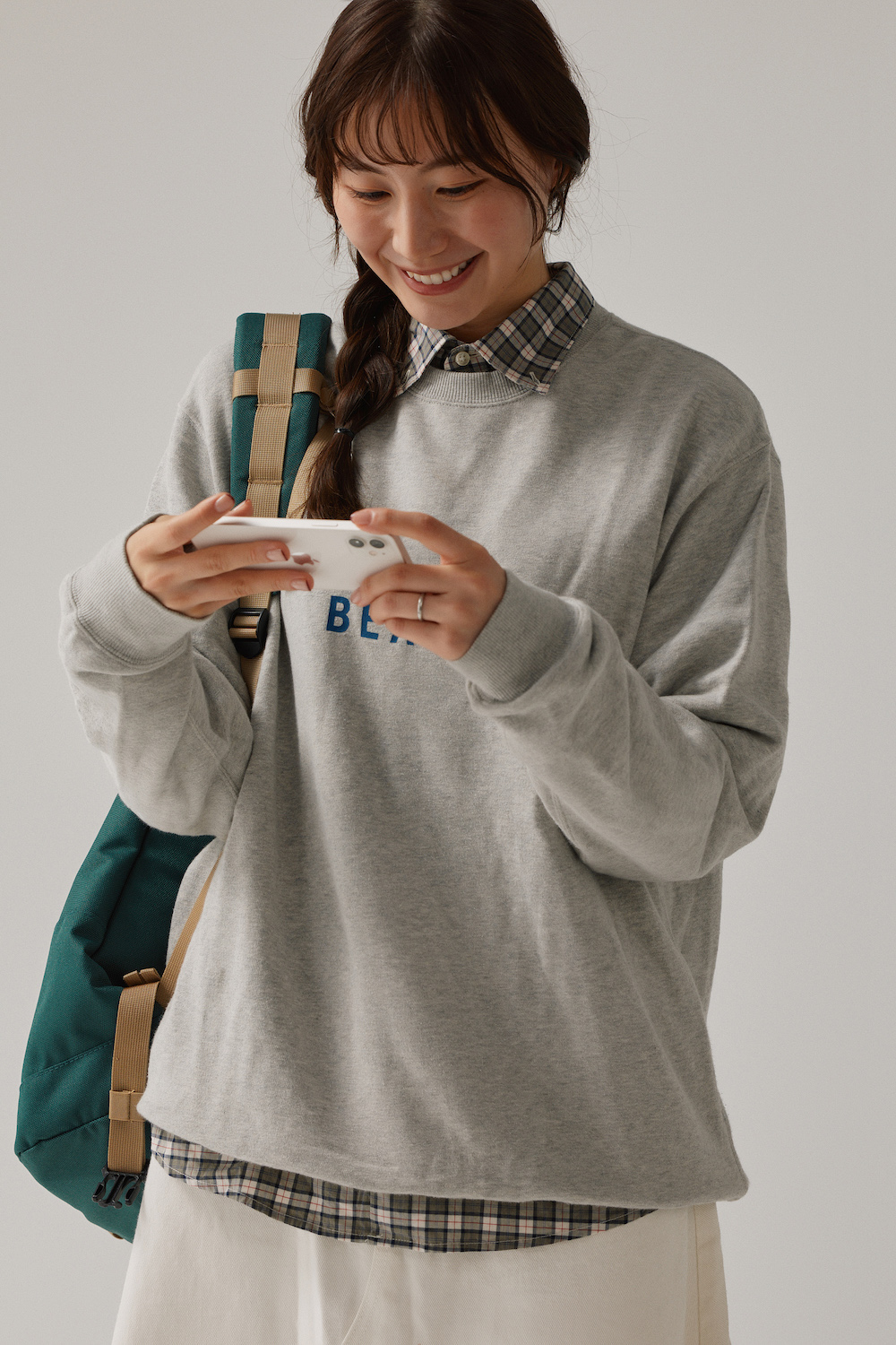 本人私物(スウェット、手に持ったボアジャケット/ともにBEAMS、シャツ/Barbour、スカート/CLO、ソックス/UNIQLO、リュック/L.L.Bean)