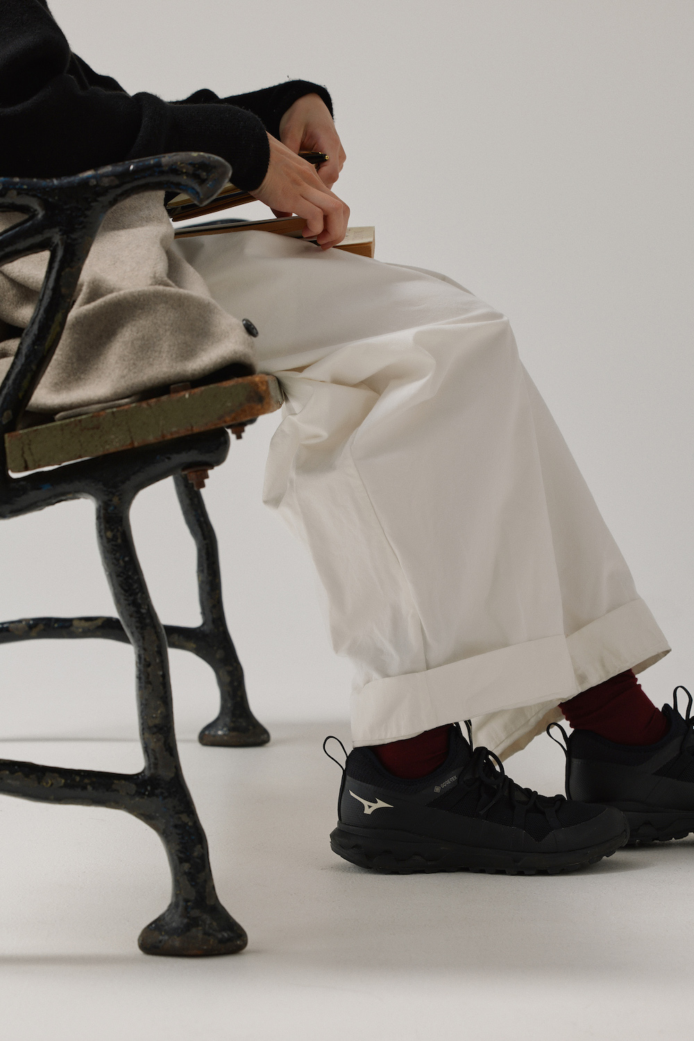 上質なカシミアニットと《ミズノ》のスニーカーの色をリンクさせて引き締めて