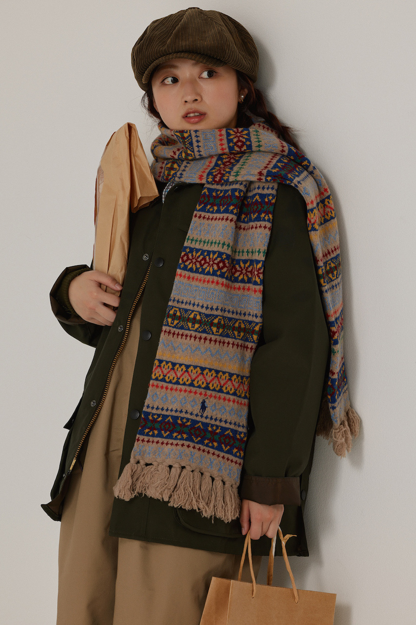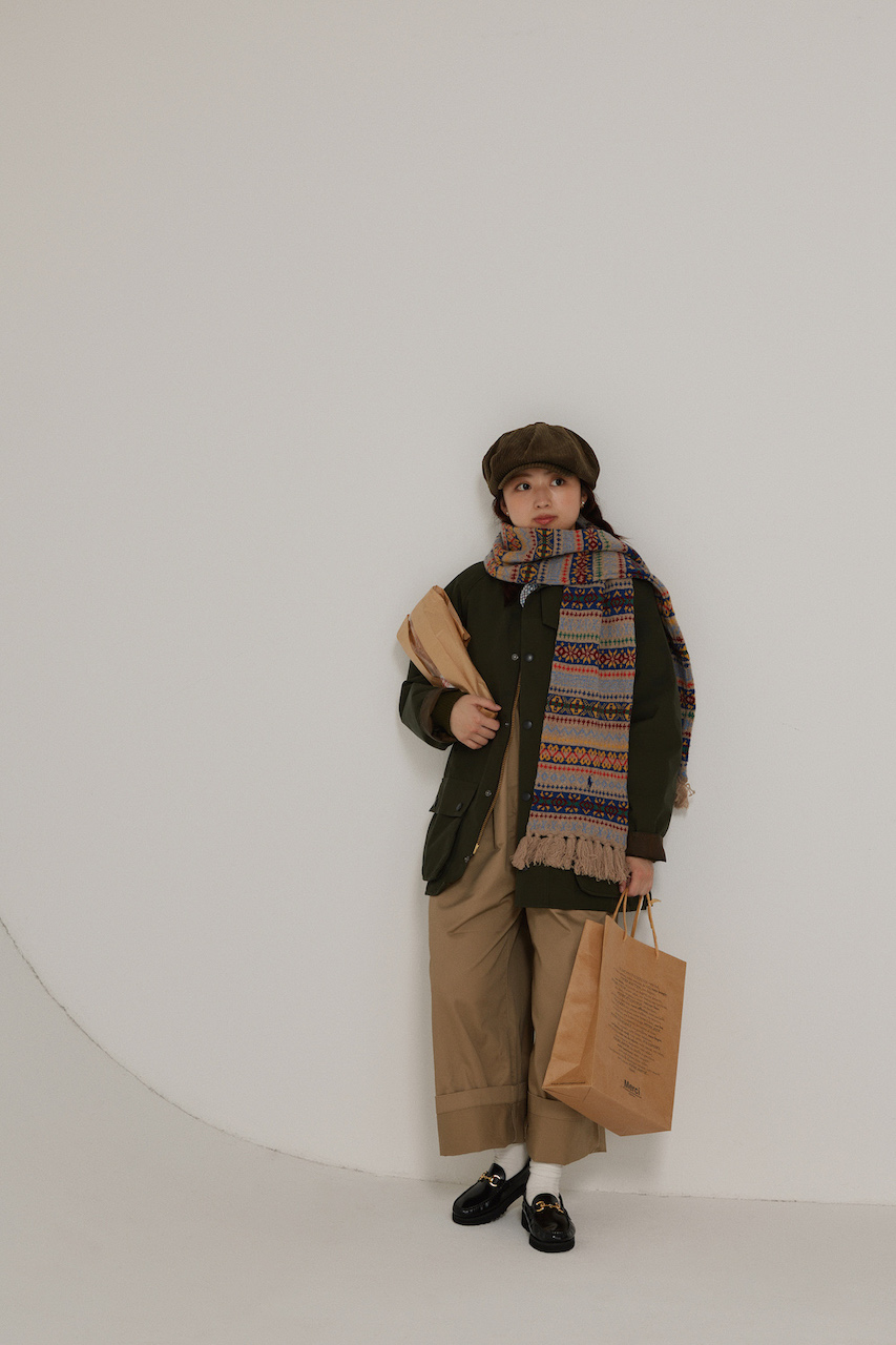 ボーイッシュアウターとゆるボトムのタッグに、華やかなフェアアイル柄マフラーをまとって冬らしさを満喫しよう。マフラー&キャスケットで顔が隠れそうな感じも可愛い!