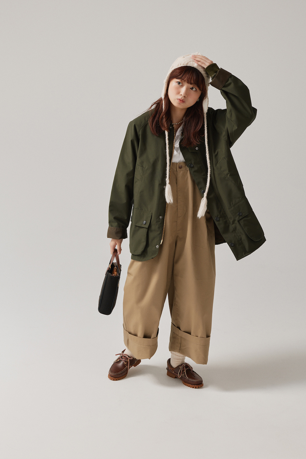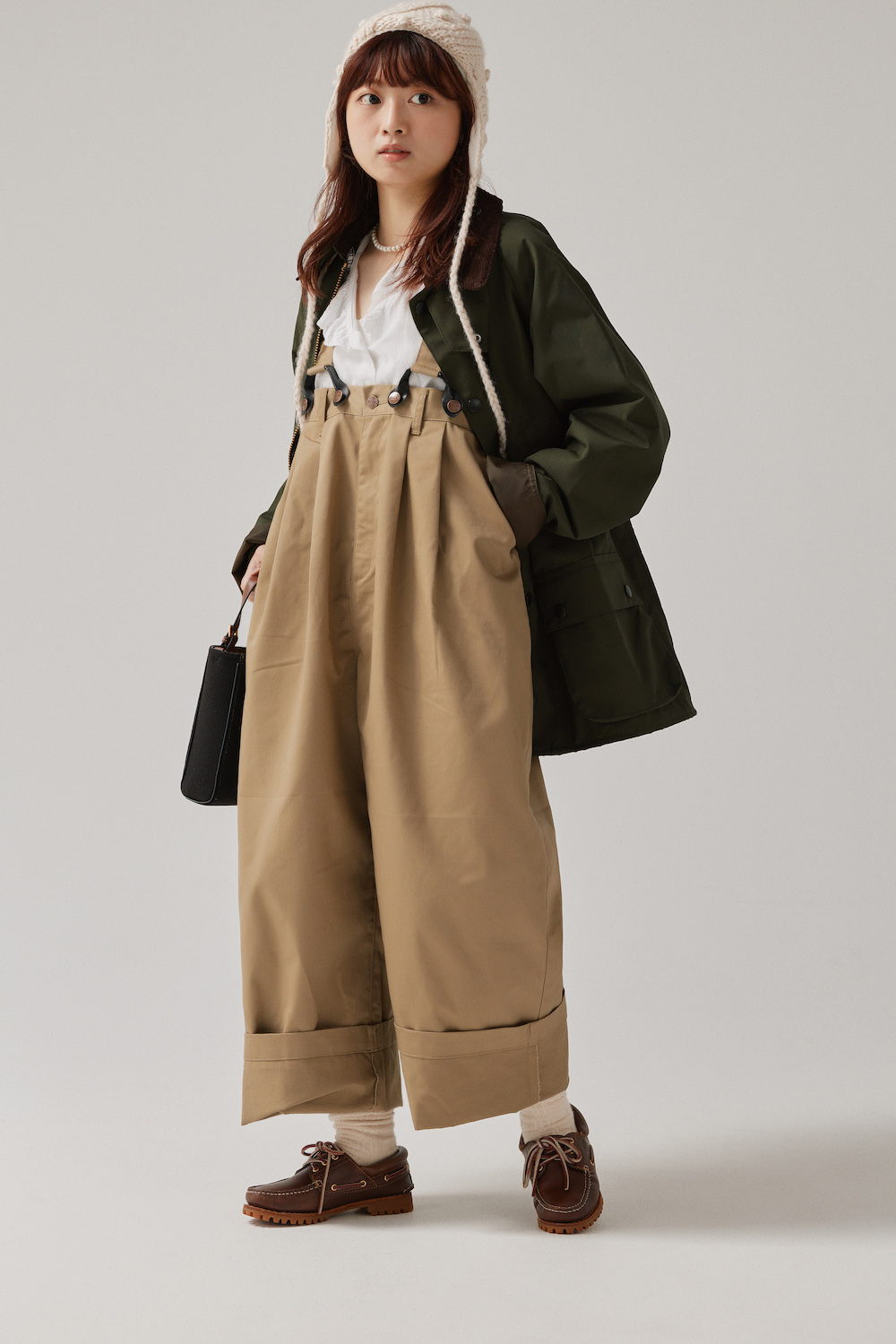 「最近、このサロペットをよく履いています。今日は、《バブアー》のアウターを羽織ってボーイッシュに。フリルシャツとパールネックレスで少し甘さをプラスして、バランスよく仕上げました。ゆるっとしたシルエットで動きやすく、秋のおでかけにぴったりなんです。私には裾がちょっと眺めだから、ワイド目に織り上げて、アクセントにしています」