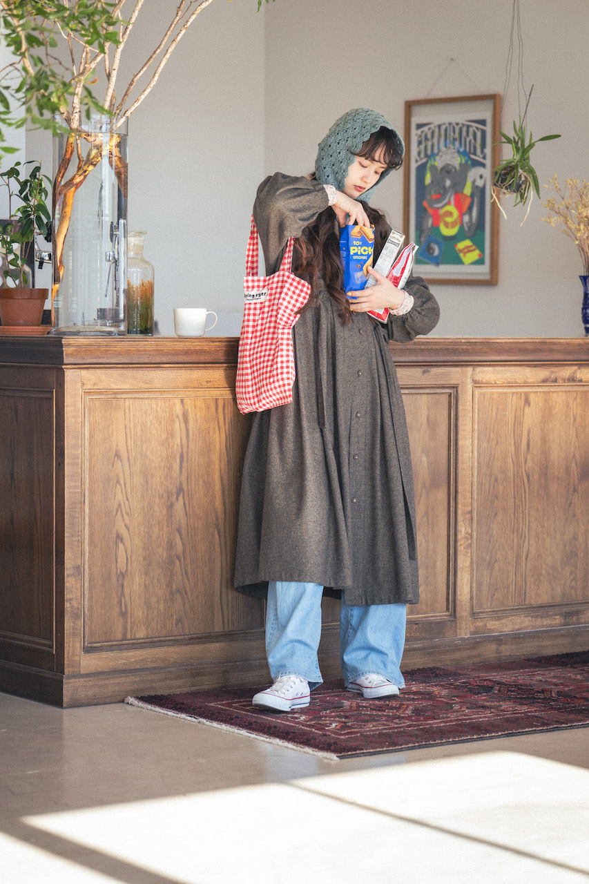 ワンピースのように着たブラウンコートは、ライトカラーデニムでカジュアルダウンしよう。手編みのボンネットが冬コーデの差し色になって、爽やかな雰囲気を纏える。