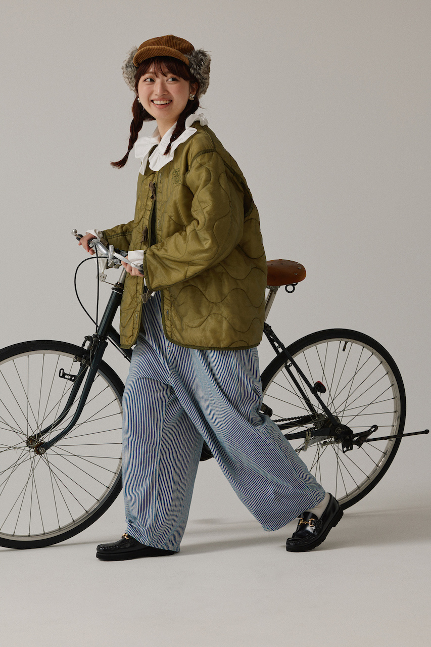 刺繍がおしゃれなキルティングジャケットは、フリルシャツをINして甘い雰囲気を出して。耳元のファーがキュートなコーデュロイハットをカジュアルスタイルのアクセントに。