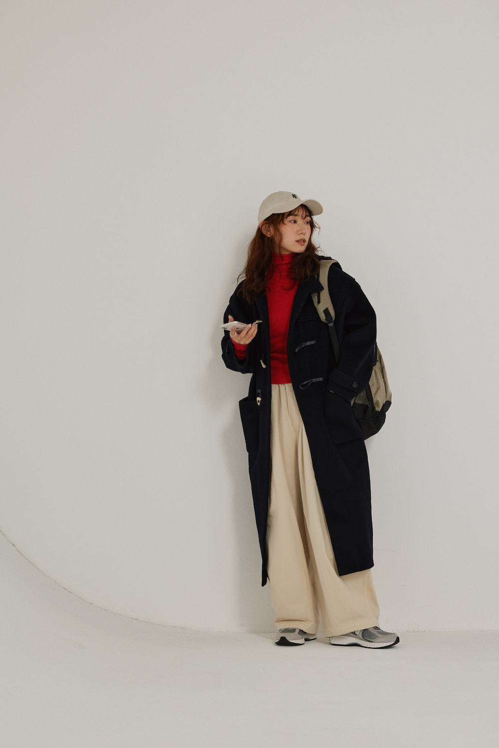 本人私物(キャップ/NEW ERA、ニット/Chillfar、コート/Na.e、パンツ/HARVESTY、バックパック/Colombia、スニーカー/New Balance)