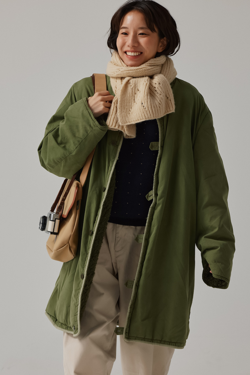 「古着のミリタリーアウターを軸にした着こなしです。ヴィンテージショップで見つけたもので、もともとスウェーデン軍がコートの中に着ていたライナーらしいんです。北欧で使われていただけに、保温性は抜群。どんなに寒い日でもこれを着ていればぽかぽかです。せっかくなので、ミリタリー感のあるチノパンを合わせて、カジュアルにまとめて。ちょっとだけレディな要素をトッピングすれば、子供っぽくなりません。冬のごきげんお散歩コーディネートです」