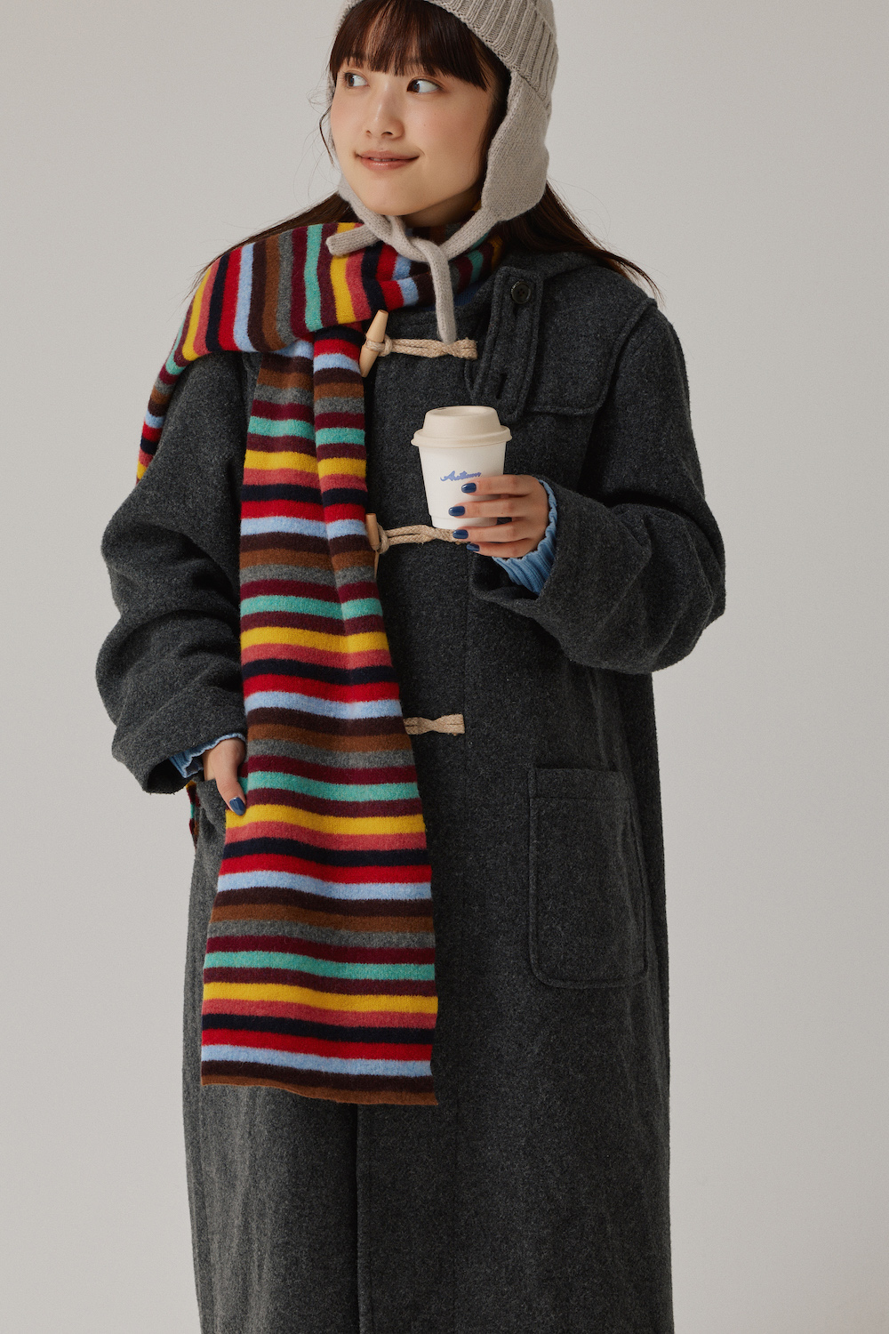 「グレーのダッフルコートにはカラフルなマフラーが映える!だからこの冬は、このマルチボーダーマフラーを大活躍させています。マフラーは顔の印象を明るく元気に見せてくれる効果も期待できるからいいですよね。冬は着こんでしまうからアクセサリーがなかなか映えなくて悩みどころだったんだけど、このマフラーの華やかさはもはやアクセサリー以上!セーター&ネイルはマフラーの一色を拾ったブルーに。こっそりリンクさせていること、気づいてもらえたかな」