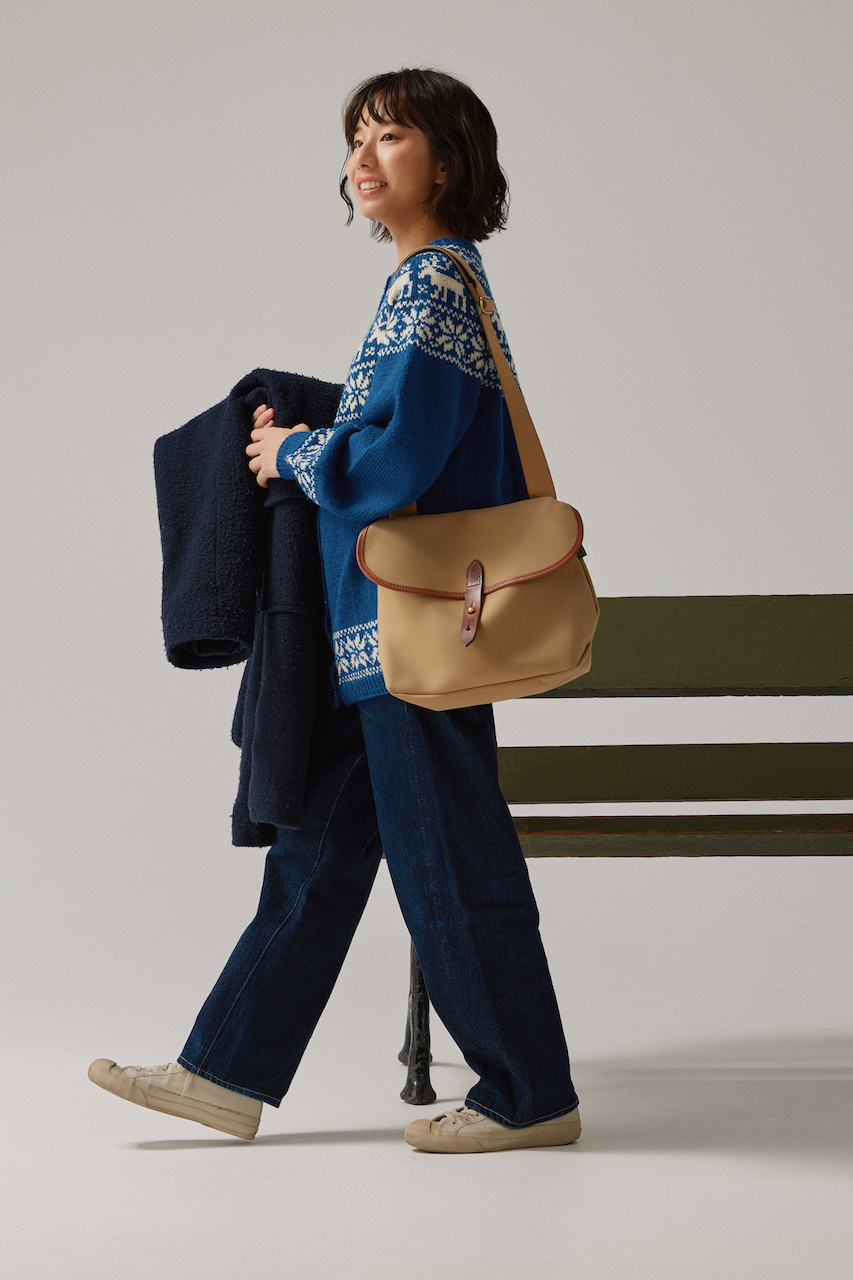 ざっくりシルエットが愛らしいノルディックセーターは同系色のインディゴデニムを合わせて爽やかに着こなして。小物はボーイッシュなデザインを選ぶとお洒落にまとまる。
