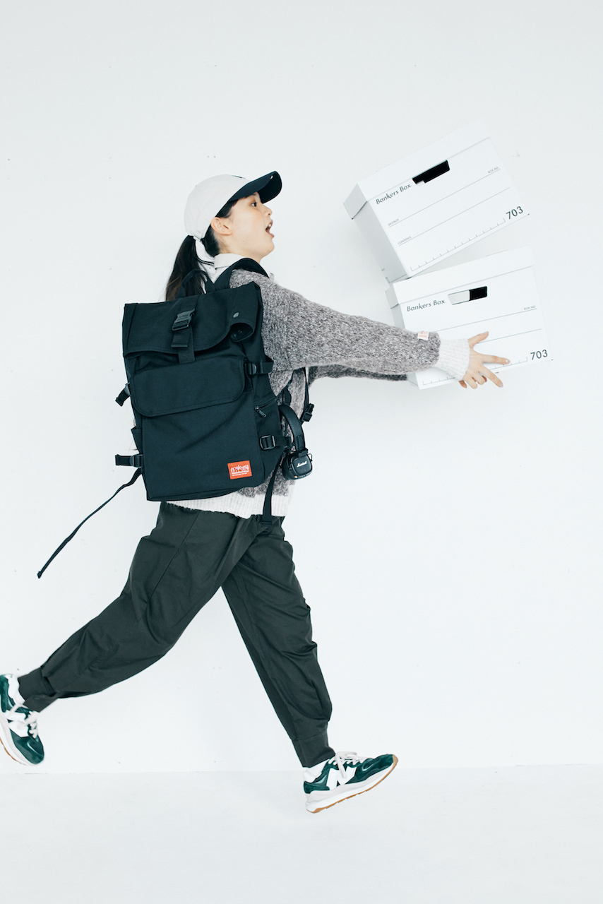 厚手ニットは着膨れしないように配色やシルエットでスッキリ見せるのが近道。グレー&ホワイトのニットとブラックパンツを合わせてアクティブなモノトーンルックを目指そう。
