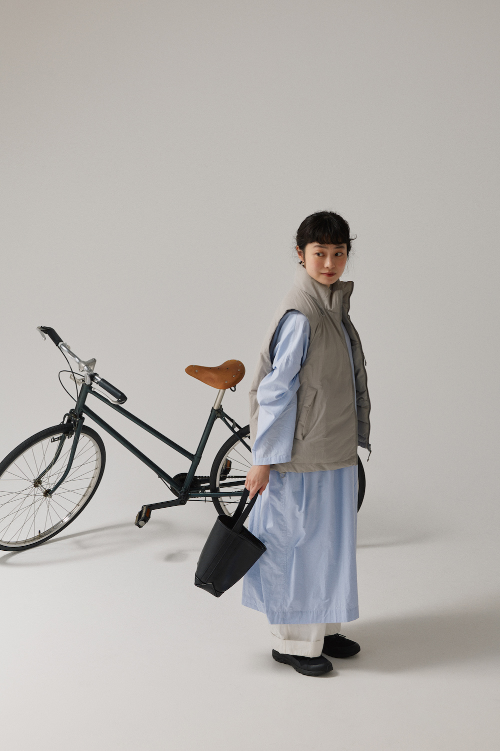 「私といえば……と覚えてくださっている方もいらっしゃるのでは。このライトブルーのシャツワンピースは、大好きすぎて、通年で袖を通している一枚です。季節の変わり目には、グレーのダウンベストを重ねています。ブルー×グレーは上品で大人っぽくて、華やかすぎない色合わせ。冬から春に向かうタイミングにぴったりだなって思うんです。ベストはメンズ用でしたが、店頭で見つけて、ひとめ惚れ。すぐに試着して購入した、思い入れの強い一枚です」