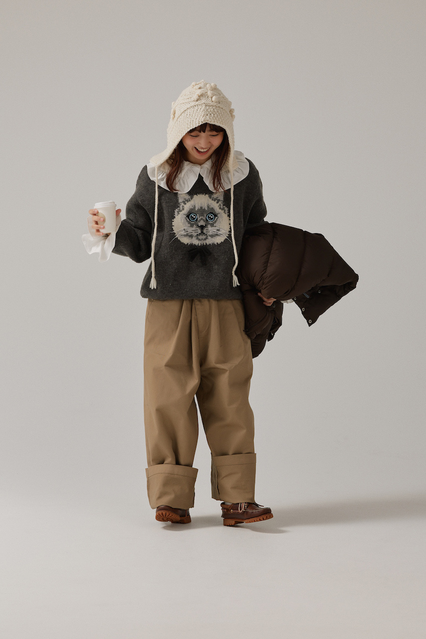 ひとくせある極太チノパンは、愛らしいモチーフニットでギャップを効かせて。白のフリルシャツやニット帽で顔周りに明るい色を挟むと、冬の重たい雰囲気を一蹴できる。