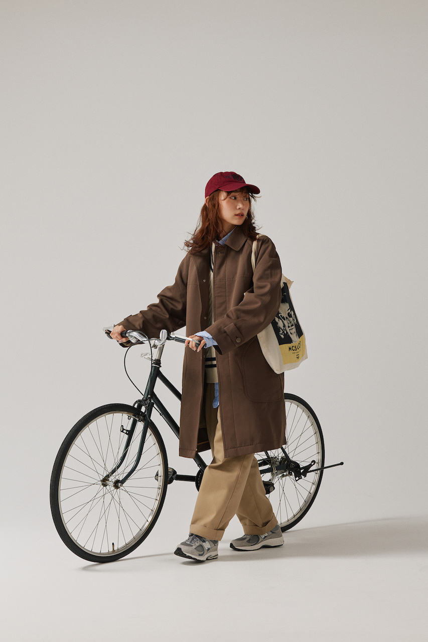 トレンドのブラウンコートは、ベーシックなチノパンでトラッドスタイルに落とし込もう。シャツやチルデンニットできちんと感を出し、キャップ&スニーカーでラフにハズして。