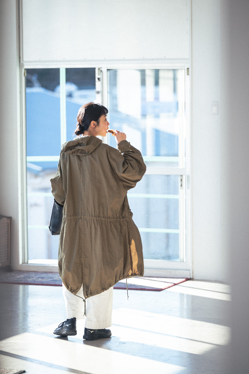 薄手のワークコートとリネンニットで素材感から春へシフト