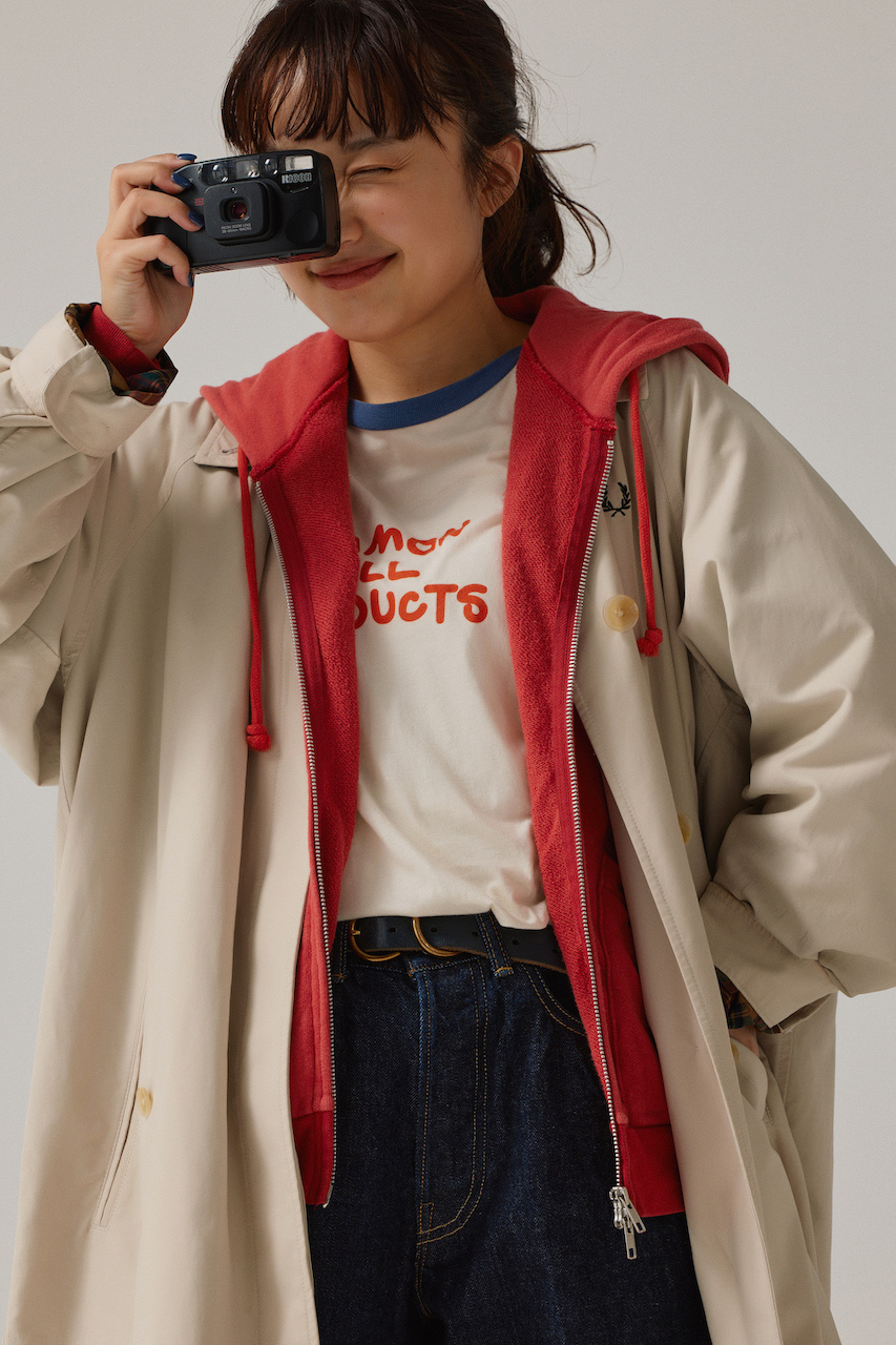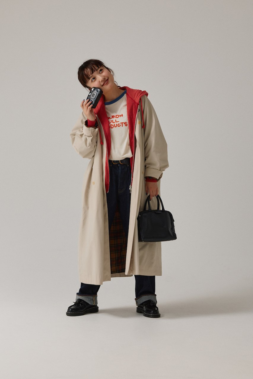 Tシャツのロゴとリンクさせた赤パーカを差し色に、カジュアルな春コートスタイルへ。淡いカラーのアウターを濃いインディゴデニムで引き締めて、スッキリ見せるのもポイント。
