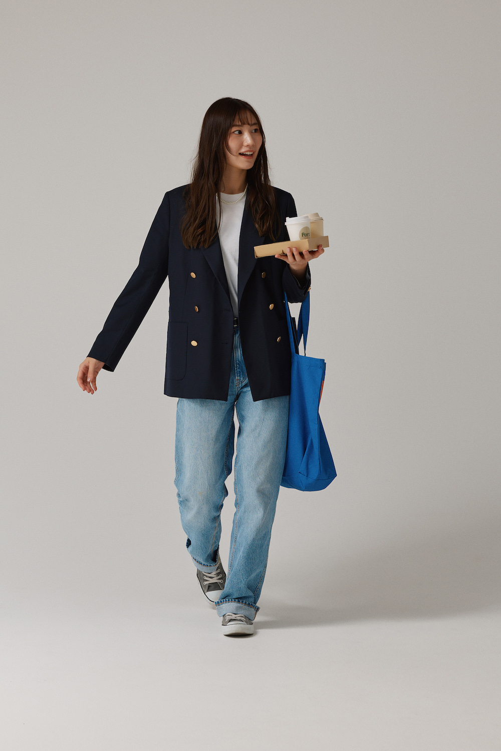 「春の始まりに着るって決めていたのが、こんな着こなし。シンプルでさわやかな白Tに紺ブレを羽織っただけのシンプルな組み合わせです。インディゴデニムも好きだけれど、この時季は淡い色のほうが気分。ブレザーのほどよいカチッと感をキープして着たいから、Tシャツの裾は出さないできちんとベルトを締めて、仕上げにパールネックレスをプラス。堅苦しくなりすぎないように、足元はいつもの相棒《コンバース》で」