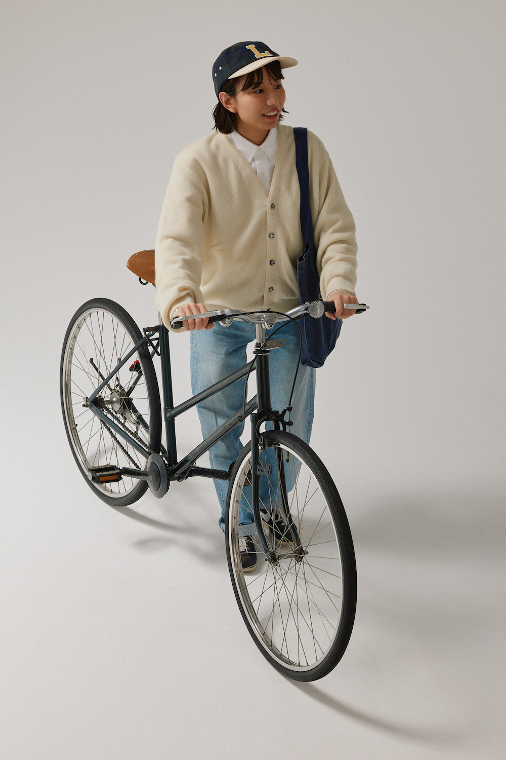 本人私物(《ラコステ》のカーディガン/USED、シャツ/UNIQLO、デニム/Levi’s、キャップ/Lee、シューズ/Nike、トートバッグ/MAISON PLISSON)