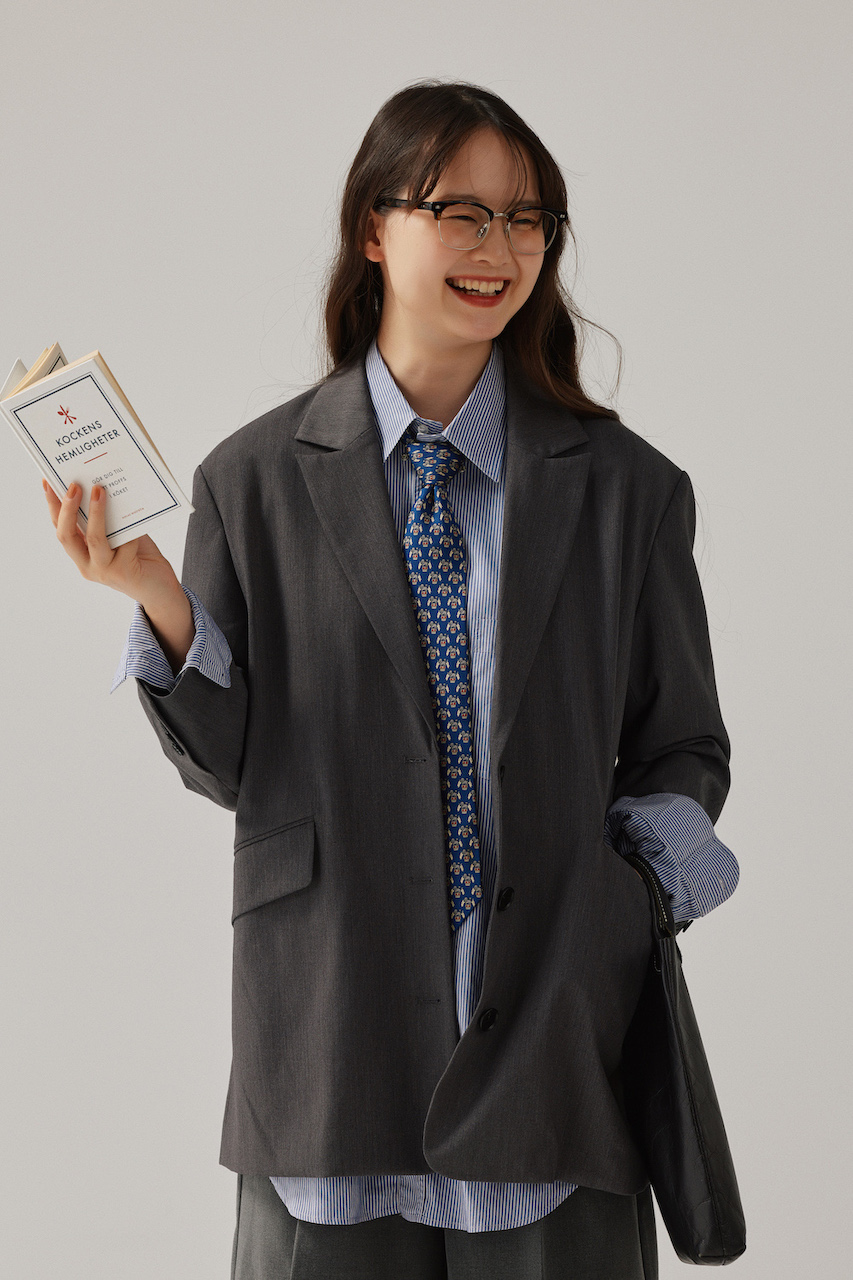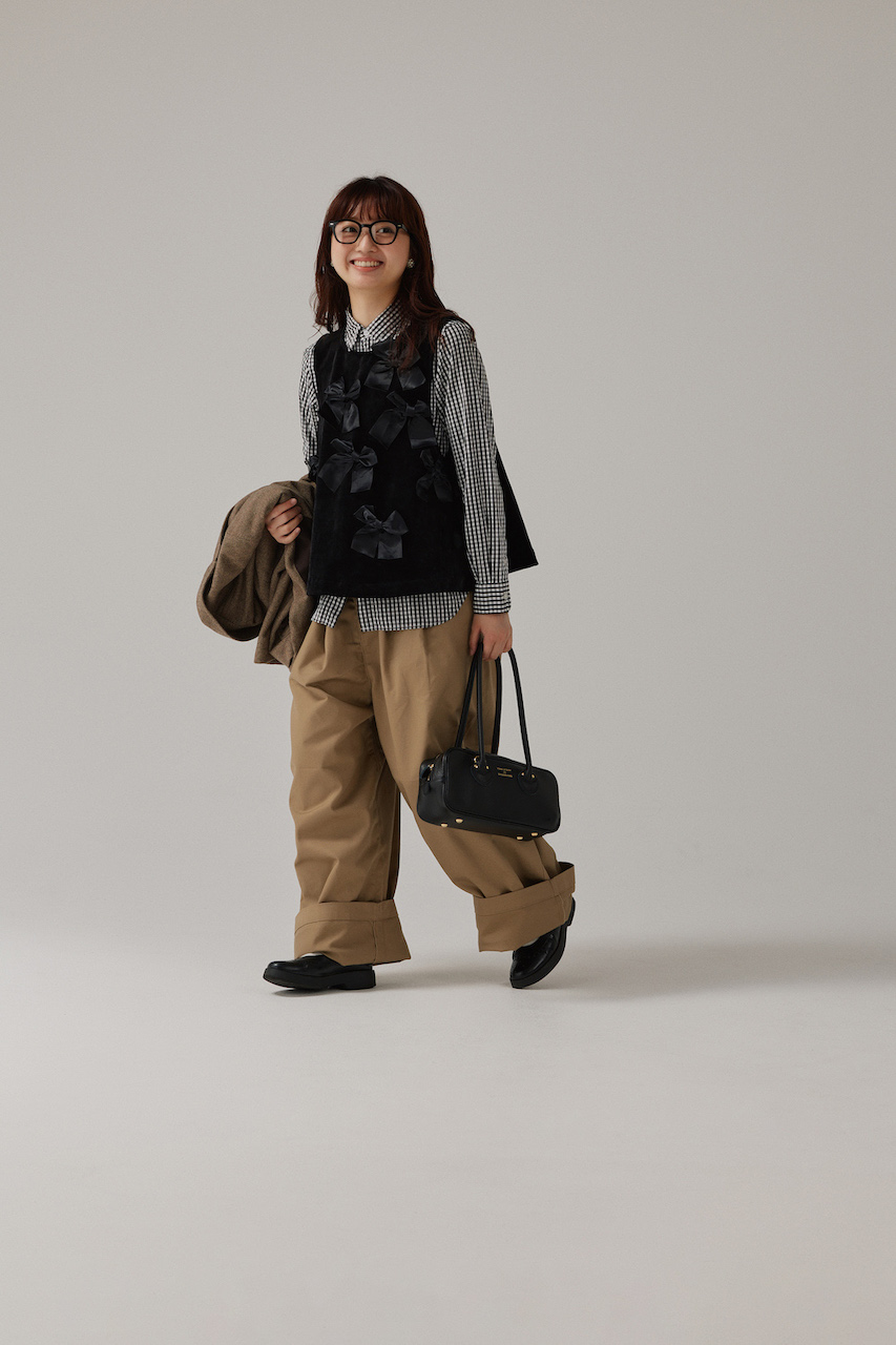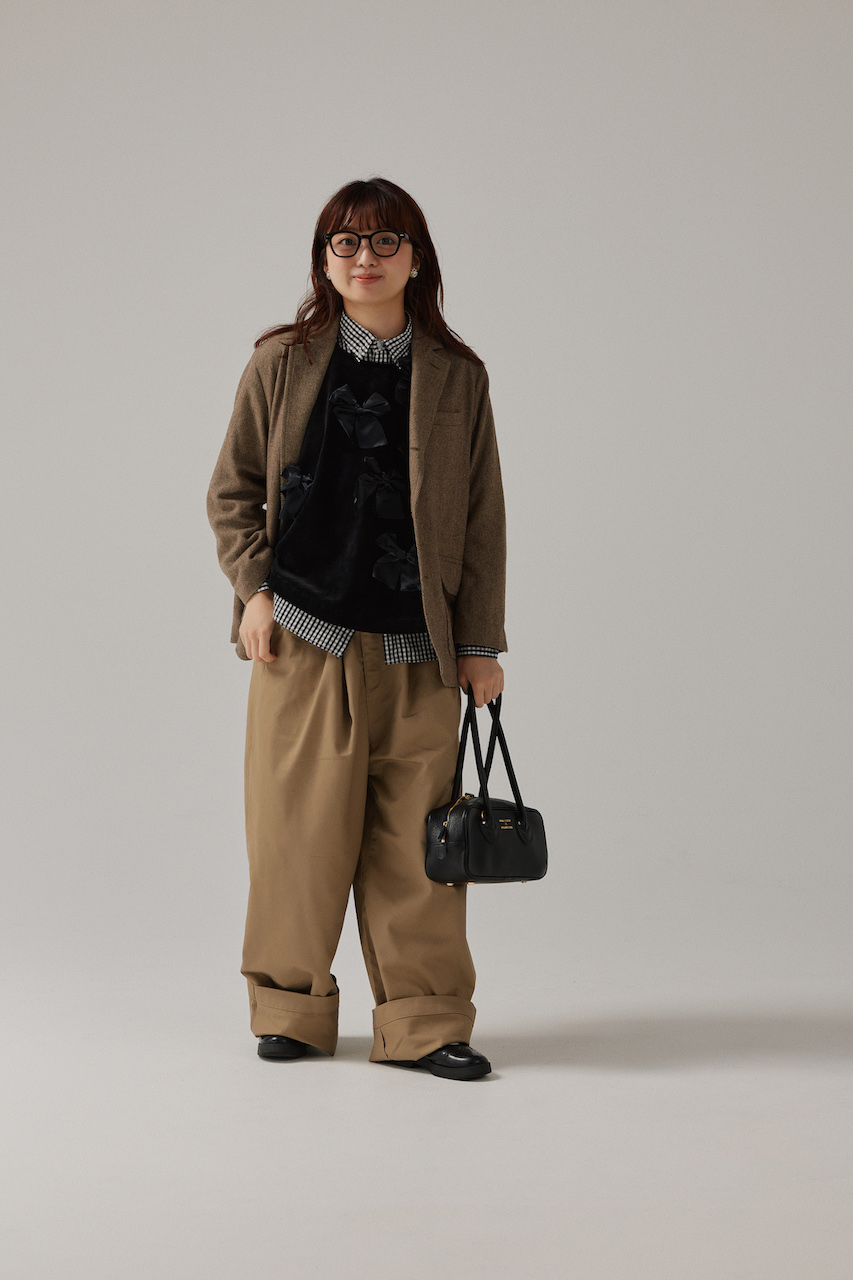 ジャケット&チノパンのトラッドタッグを、リボントップスでオリジナリティ溢れる着こなしへ。極太のチノパンなどシルエットをルーズにするとラフな雰囲気が増してより愛らしい。