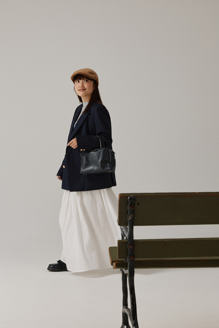 フレアに広がるスカートをキリリと引き締める紺のブレザーが引き立った上級者なMIXスタイル。カジュアルなハンチング帽とトラッドなレザーバッグ&シューズのギャップも素敵。