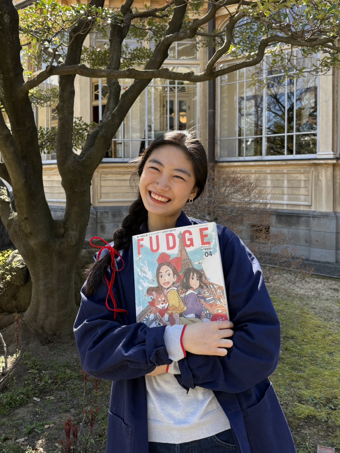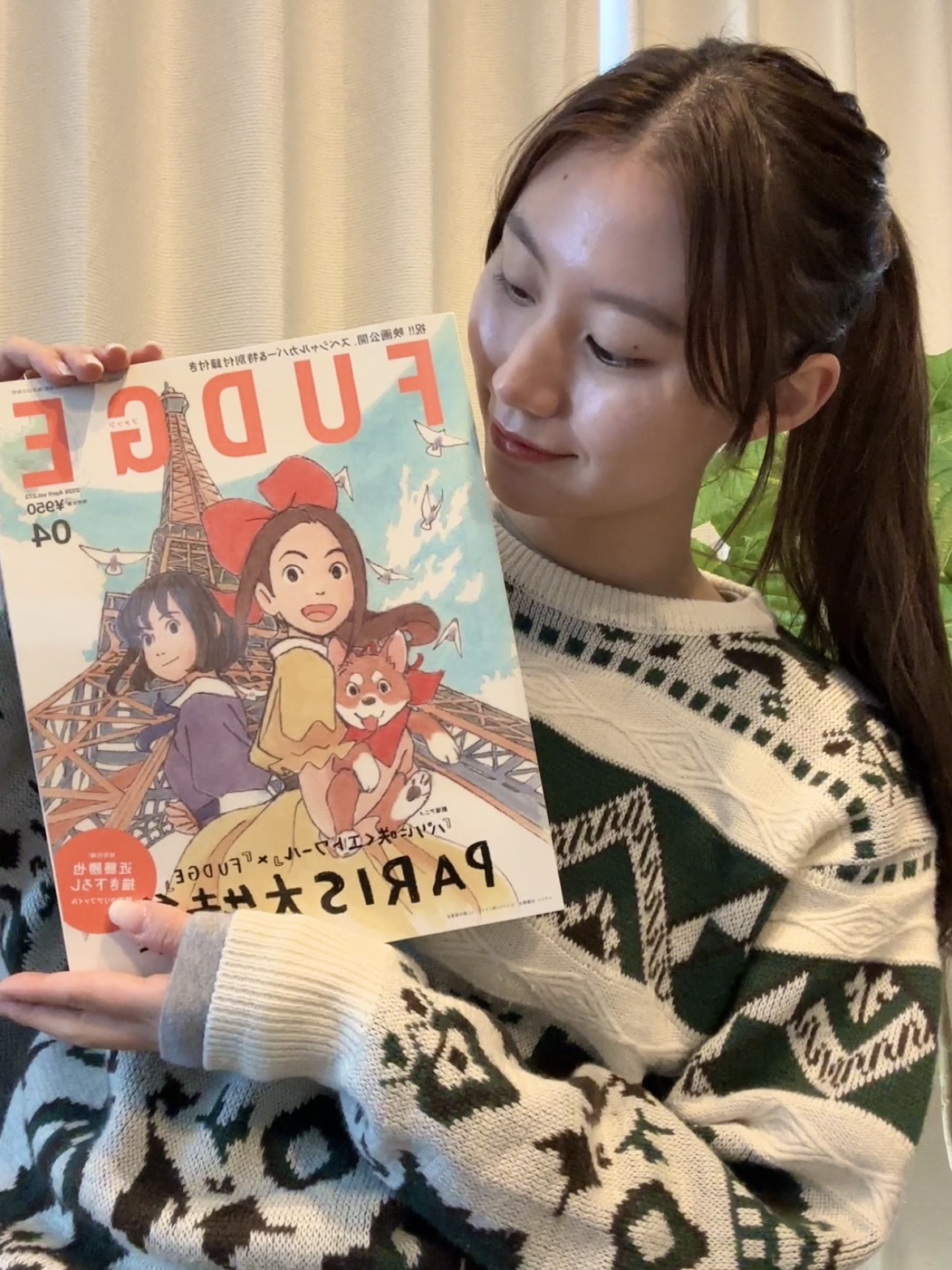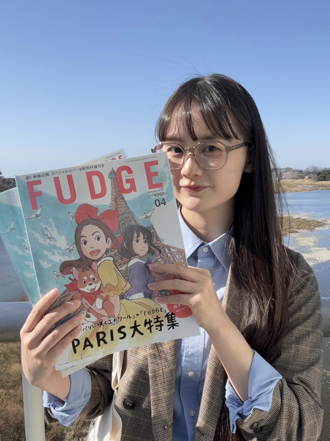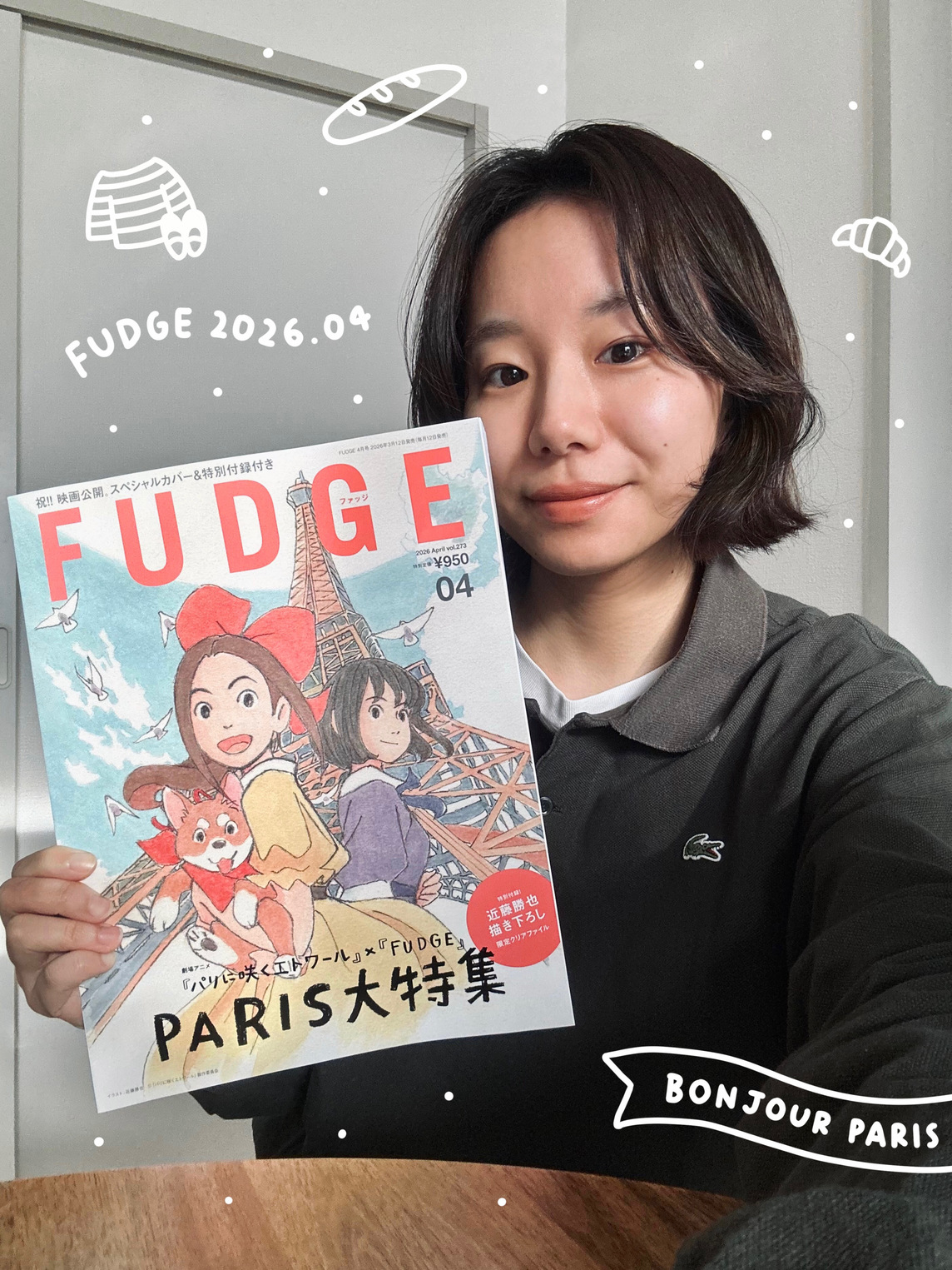 「今月号の私のお気に入りページはp.020〜『Bonjour Les Parisienne フレンチスタイルでめぐる、物語の舞台』です。わたしもいつか映画に登場した場所に行ってみたいなと思いました。『パリに咲くエトワール』の書き下ろしイラストが表紙のFUDGE4月号。ぜひチェックしてくださいね!」。