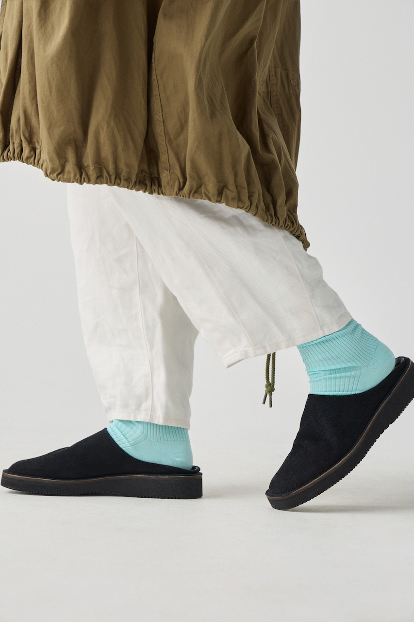 ゆったししたカーキコート&白いルーズボトムで気負わないカジュアルさを纏って。黒の小物を多めに合わせつつソックスだけ明るいブルーにして差し色にするのがポイント。