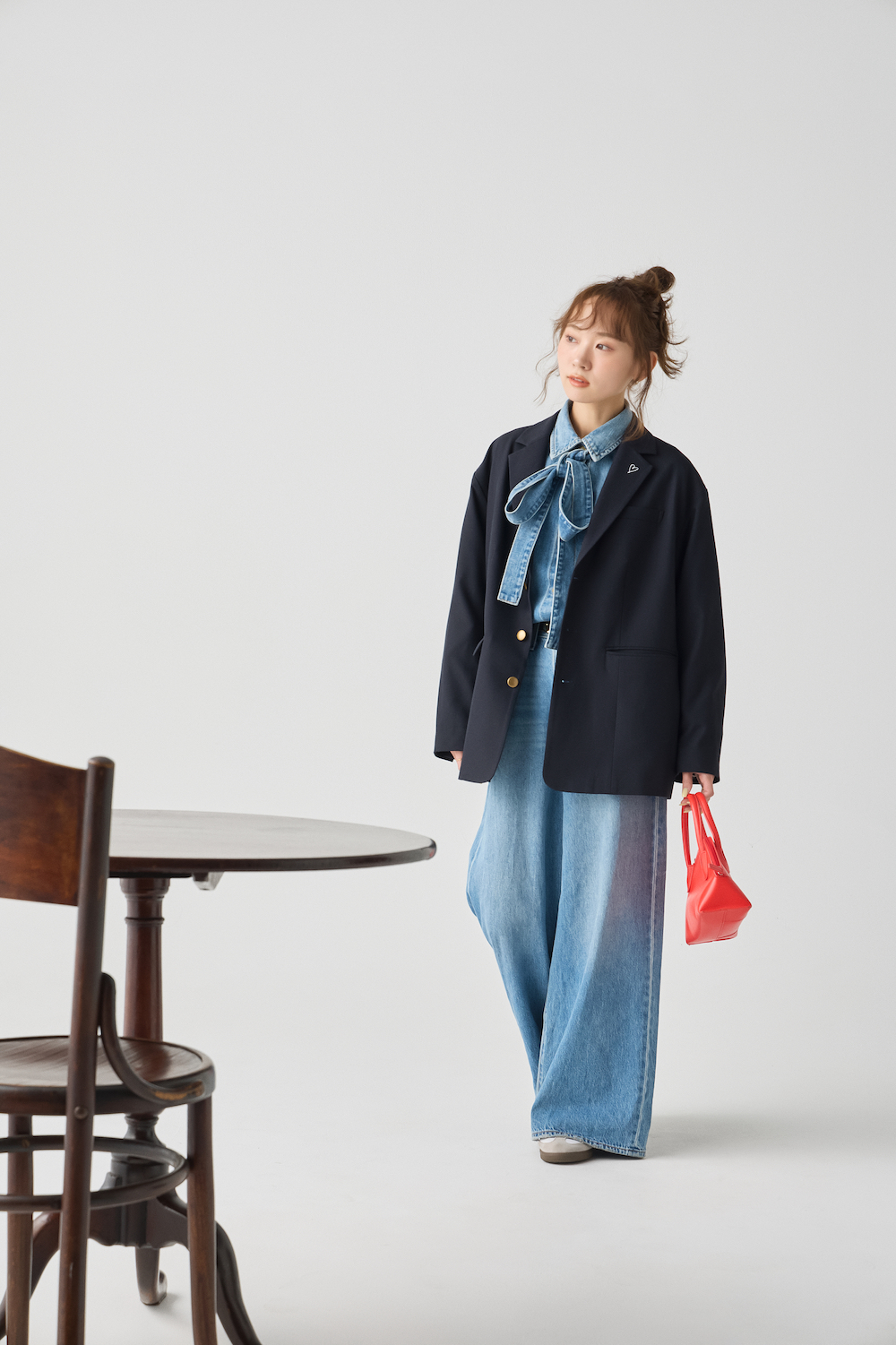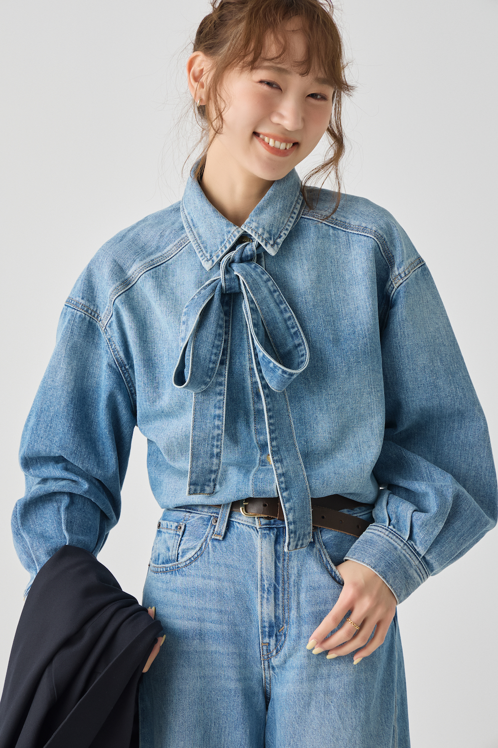 「タイがついたデニムシャツにひと目惚れ!ブランドは違うけれど色が合うデニムパンツを合わせて、セットアップ風にして着てみました。パンツがワイドシルエットでカジュアルなので、あえてちょっとエレガントにまとめると可愛いいだろうなって思って、サラッとジャケットをオン。フォーマルとは違うけれど、大人っぽくてきれいめに仕上がって大満足。UMI×FUDGEオリジナルジャケットはやっぱり万能…!」