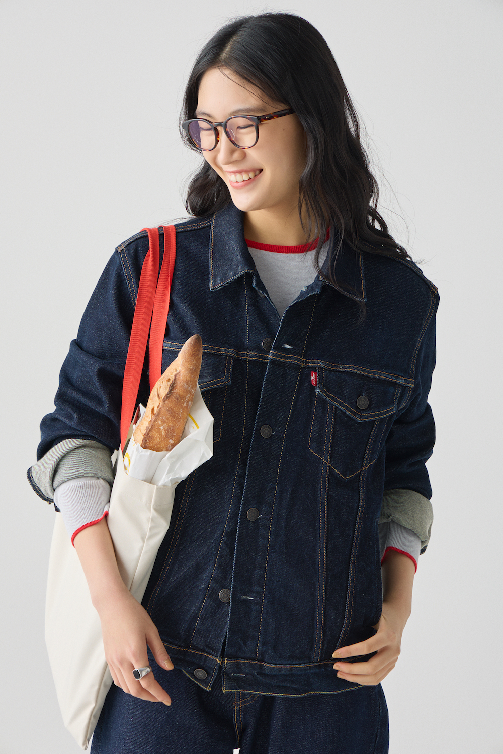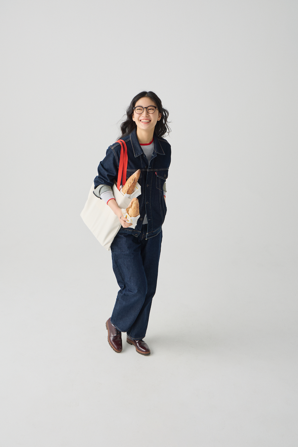 本人私物(デニムジャケット、デニムパンツ/ともに Levi’s、トップス/MACKINTOSH PHILOSOPHY、シューズ/USED、メガネ/JINS、トートバッグ/PLAZA)