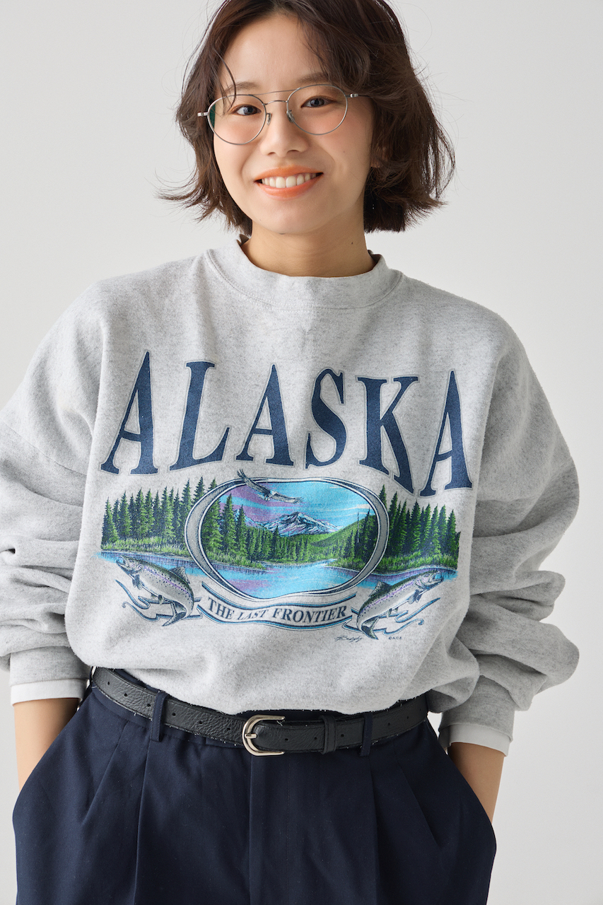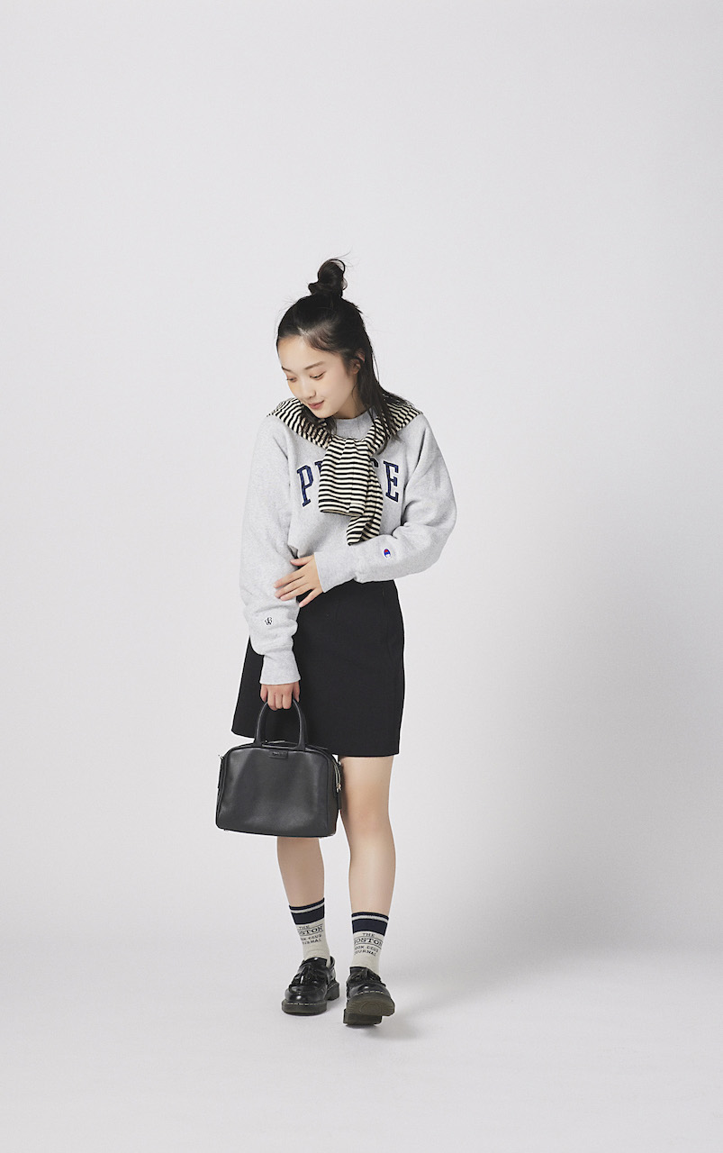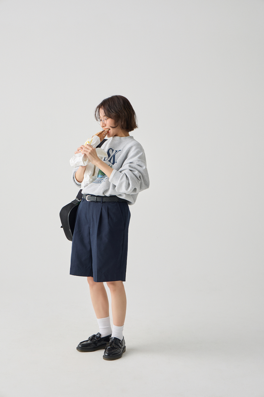 個性が際立つユーズドのスウェットは、ボーイッシュなハーフパンツでプレッピーに着るのが可愛い。ベルトマークしたり、品のある黒小物を選んできちんと感を足してあげよう。