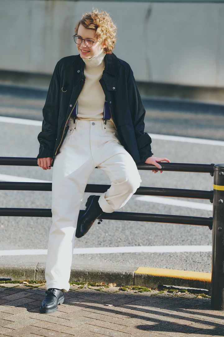 ジャケット¥61600/Barbour(バブアーパートナーズ ジャパン)、タートルネックセーター¥42900/Yonetomi×Spiber(ヨネトミストア)、デニムパンツ¥31900/ANATOMICA(アナトミカ 東京)、メガネ¥93500/10 eyevan(コンティニュエ)、サスペンダー¥20900/ALBERT THUESTON(真下商事)、シューズ¥92400/Paraboot(パラブーツ青山店)